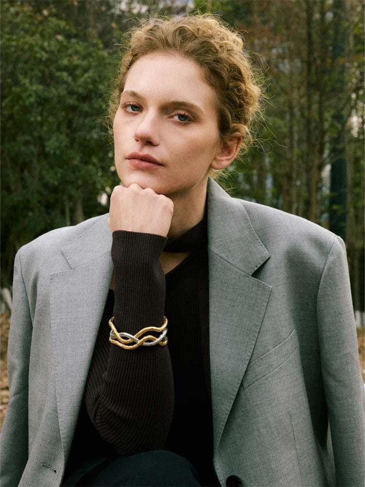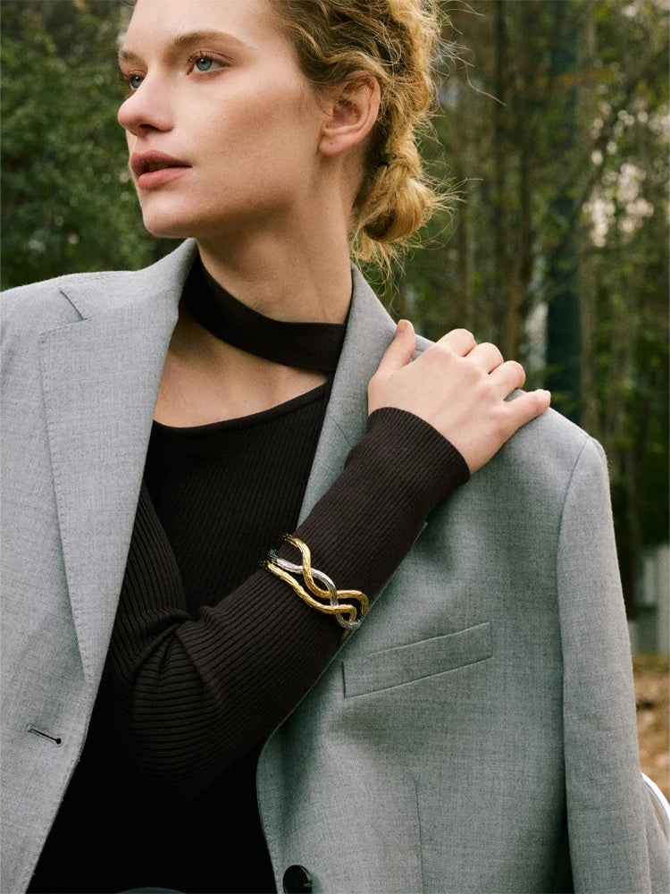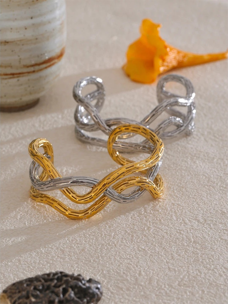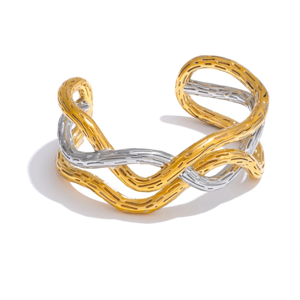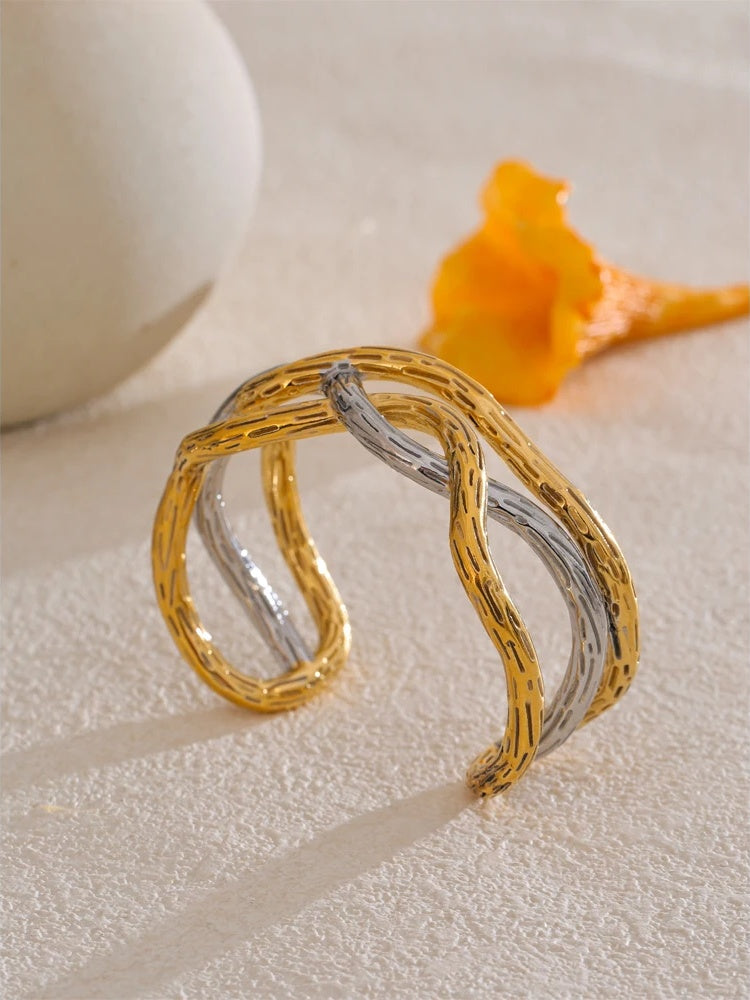 Elevate your everyday look with a modern cuff bracelet crafted for versatility and longevity. This mixed-metal piece is built on durable stainless steel and finished with 18K gold PVD plating, offering a refined glow and a sleek contrast that complements both casual and dressy outfits.
