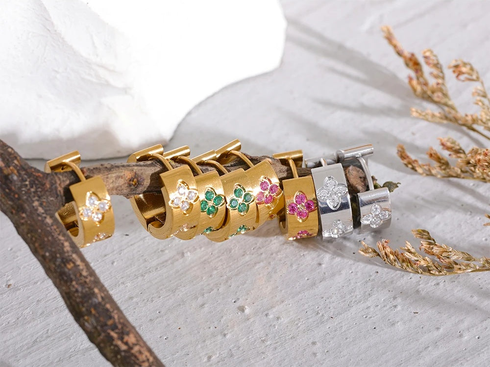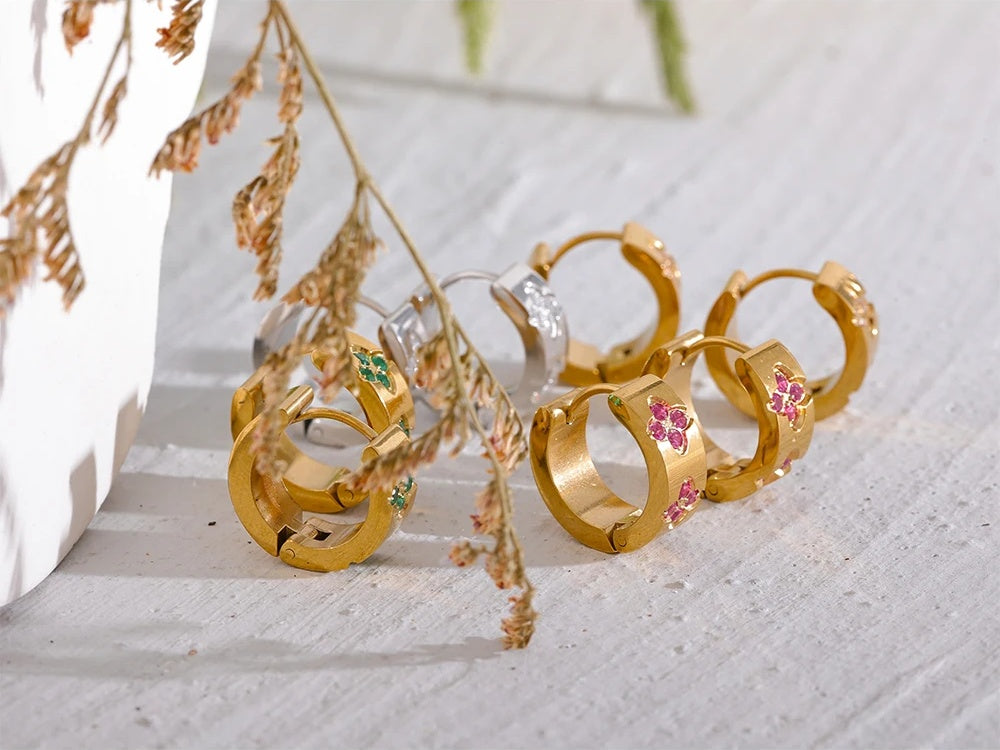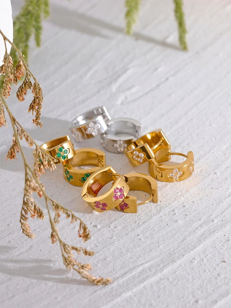 Crafted from durable stainless steel with a PVD real gold plating, these hoop earrings offer a stylish and long-lasting finish. Featuring vibrant cubic zirconia stones set in geometric floral patterns, they provide a chic and colorful accent to any outfit. Designed for comfort and water resistance, these earrings are perfect for everyday wear or special occasions. Available in multiple color options to suit a variety of personal styles.