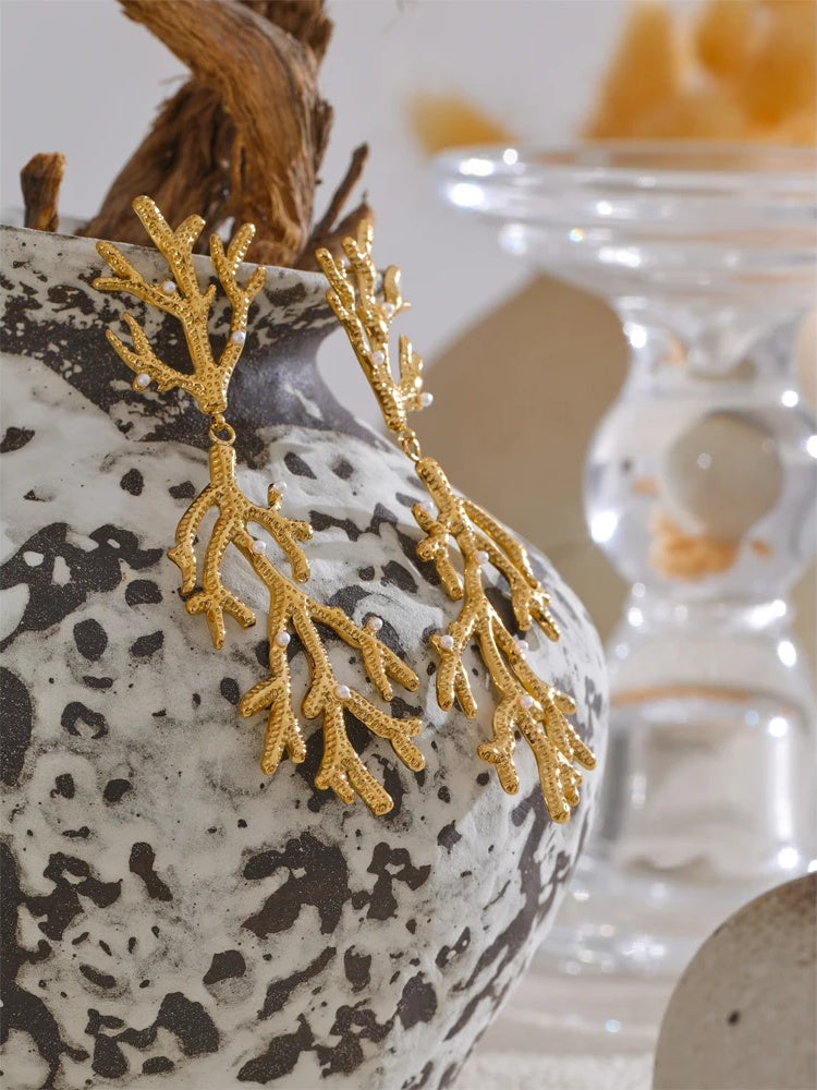 Elevate any look with these botanical-inspired drop earrings. A textured leaf motif and luminous simulated pearls create a refined balance of organic detail and modern geometry—perfect for everyday polish or a special night out. Crafted from stainless steel and finished with real gold PVD plating, these gold-plated earrings offer a durable, tarnish-resistant shine designed for long-lasting wear.