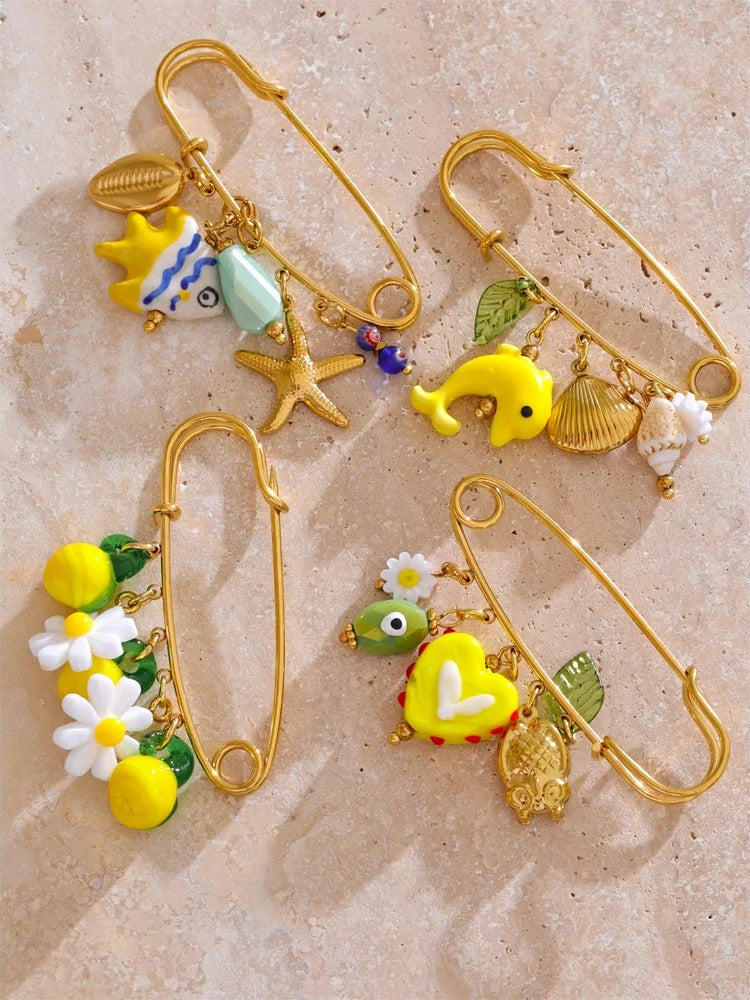A collection of trendy safety pin brooches featuring playful charms like strawberries, hearts, flowers, and sea creatures. Crafted from durable stainless steel with an 18K golden plated finish, these pins provide a vibrant and eye-catching accent to any outfit. The lightweight design ensures comfortable wear, while the unique combination of colorful plastic and metal charms adds a fun, geometric touch. Ideal for casual or general occasions, these brooches offer versatile styling options for women.