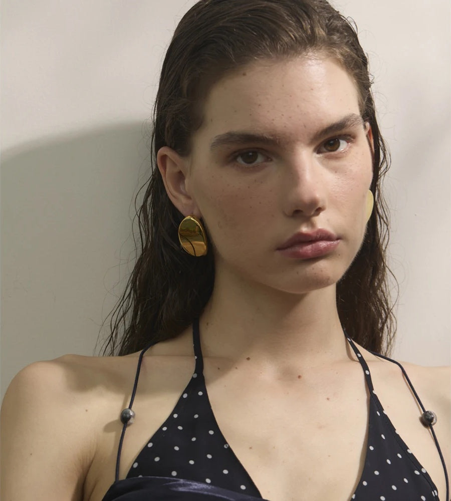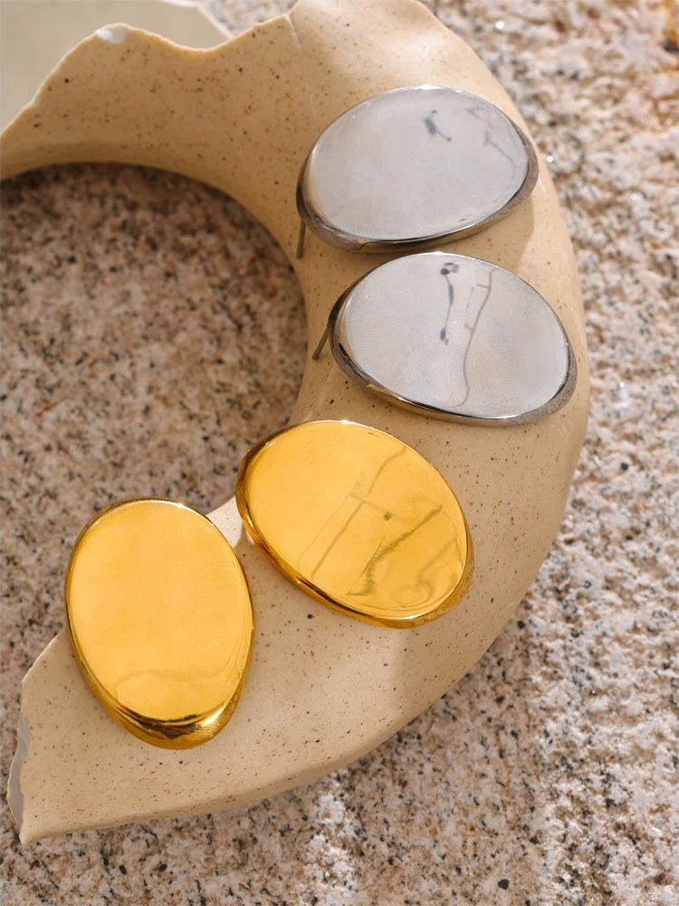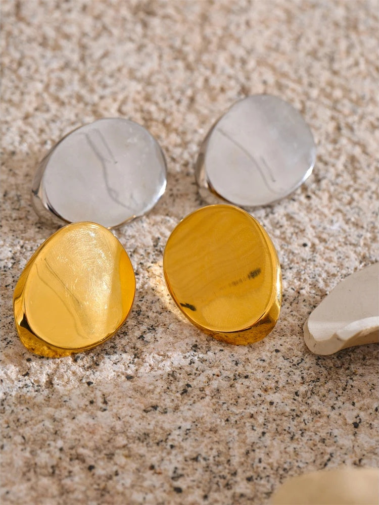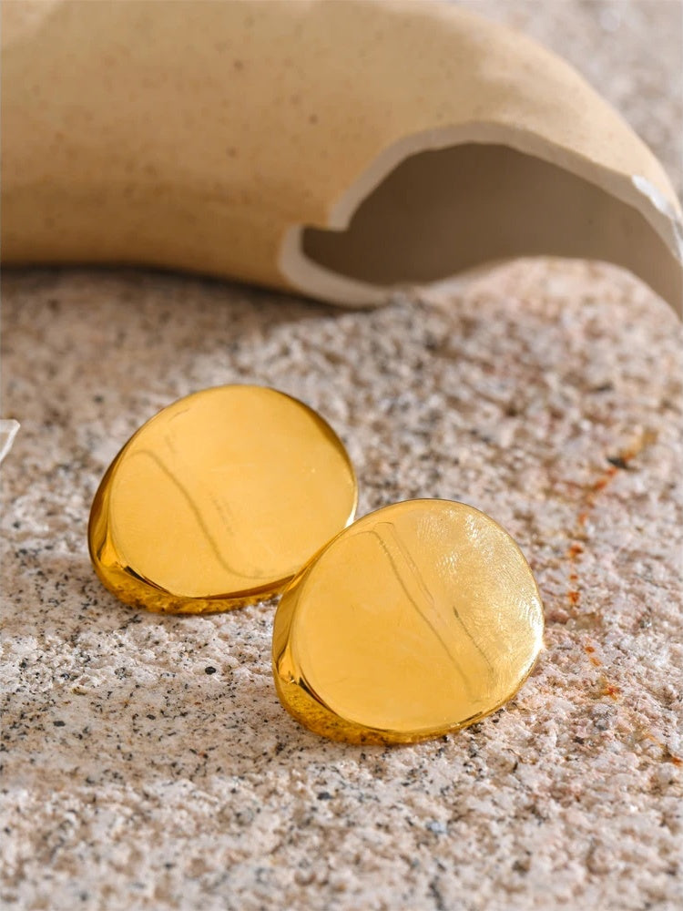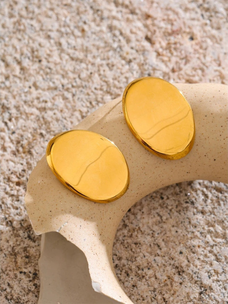 Featuring a polished, abstract geometric design, these large stud earrings offer a bold statement with a minimalist aesthetic. Crafted from stainless steel with a gold-color PVD plating, they ensure durability and a high-shine finish. The push-back closure provides secure and comfortable wear, making them suitable for versatile daily styling.