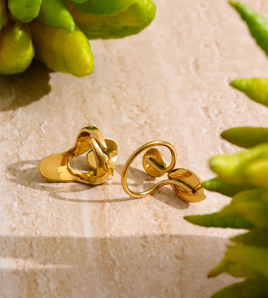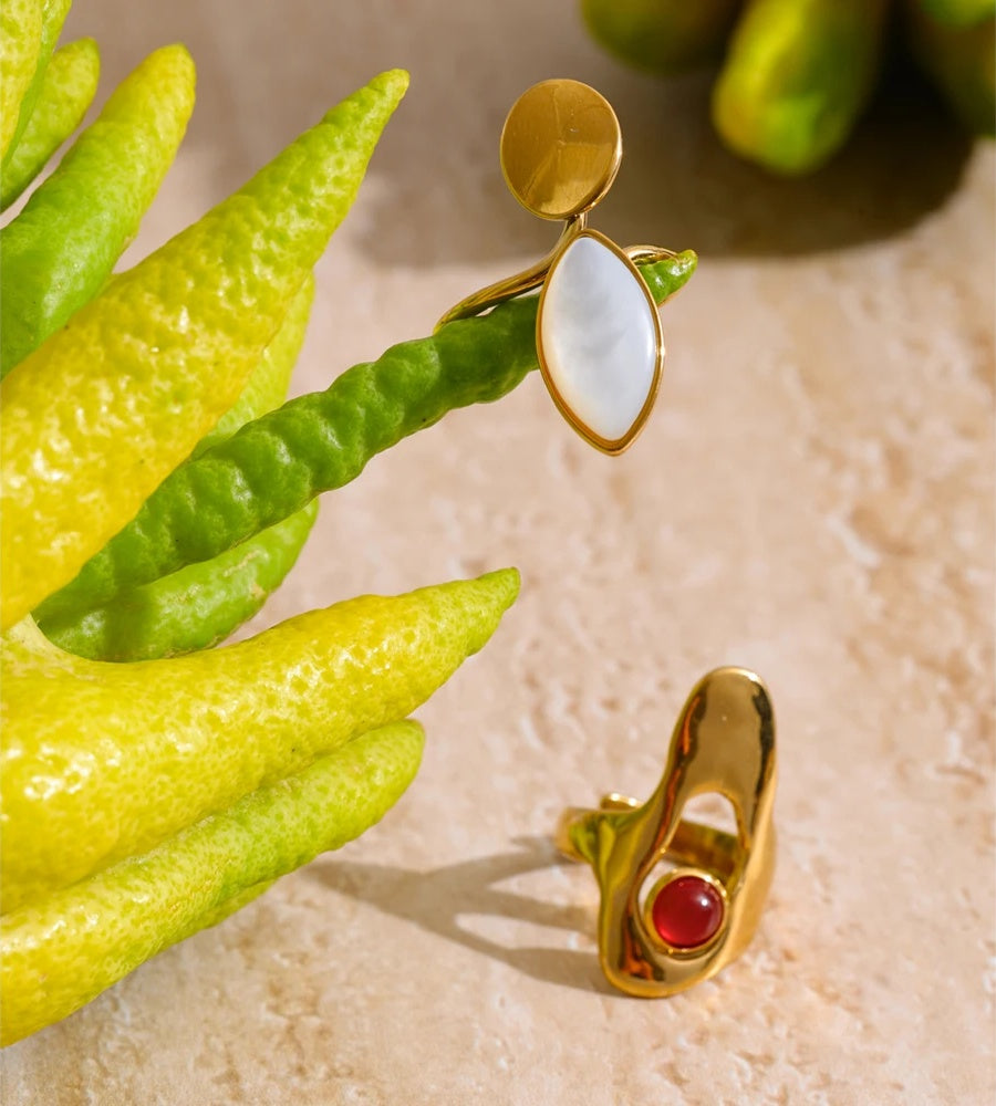 Featuring a striking geometric design, these rings combine vibrant red agate and smooth shell stones set in a durable stainless steel band. The 18k gold PVD plating ensures a rust-proof finish while adding a luxurious sheen. Resizable options provide a comfortable fit, making them perfect for everyday wear or special occasions. Their minimalist yet trendy style complements a variety of outfits with ease.