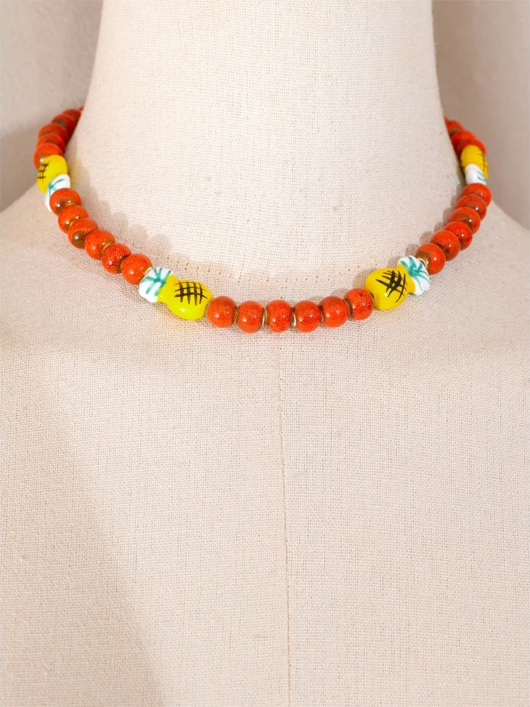 Brighten your look with a playful pop of color. This gold-plated necklace pairs vibrant red ceramic beads with sunny yellow pineapple charms, creating a cheerful blend of texture and shine. Crafted with stainless steel components and finished in durable PVD real gold plating, it balances everyday wearability with a polished, summery feel.