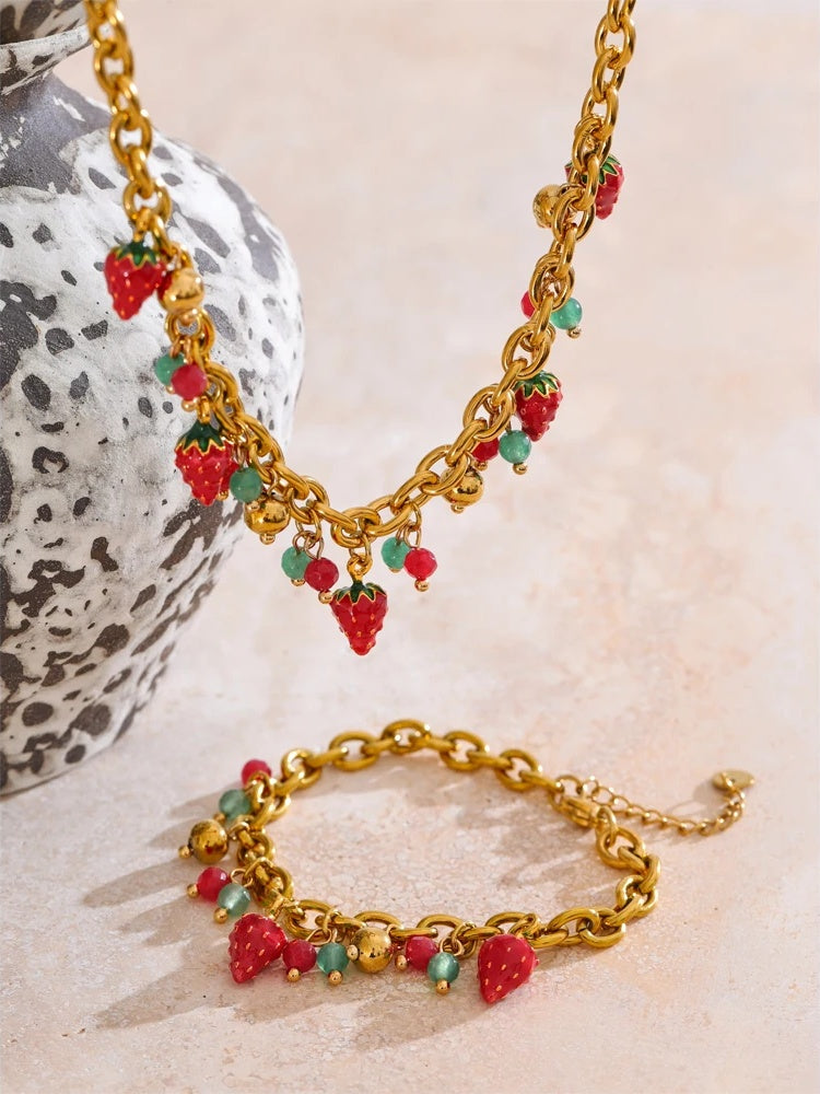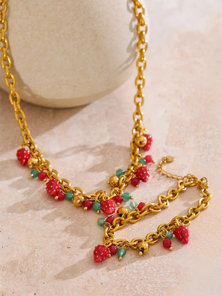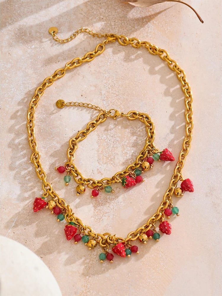 Crafted from stainless steel with a gold-color PVD plating, this jewelry set features a playful strawberry motif accented with vibrant red enamel and colorful beads. The set includes both a necklace and a bracelet, each designed with chunky chain links for a trendy, fashion-forward look. Lightweight and durable, it’s ideal for adding a touch of fun to party outfits. The geometric-inspired charm shapes bring a unique and eye-catching detail to the ensemble.