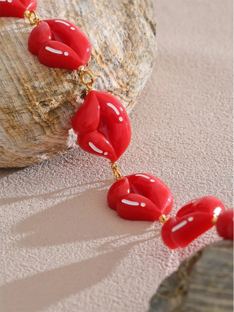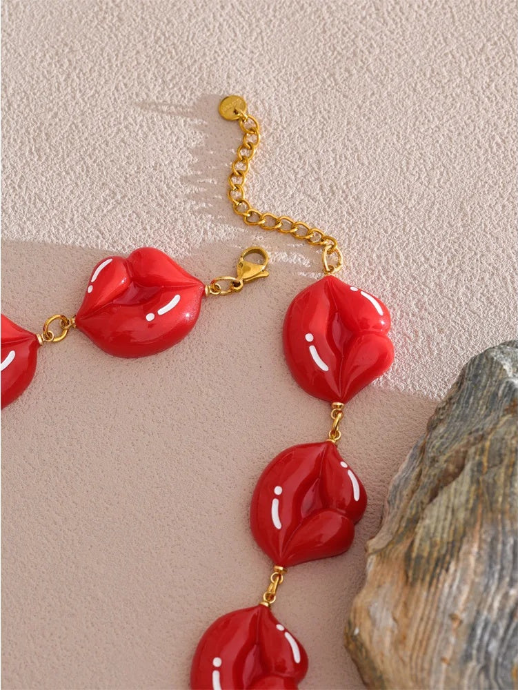 A bold chain necklace featuring glossy red resin lip-shaped charms linked together with gold-toned stainless steel. The PVD real gold plating offers durability and a polished finish that complements the vibrant red accents. Designed as a statement piece, it suits party wear and trendy fashion styles, adding a unique geometric pattern to any outfit. Compatible with all styles, it offers a playful yet stylish accessory option.