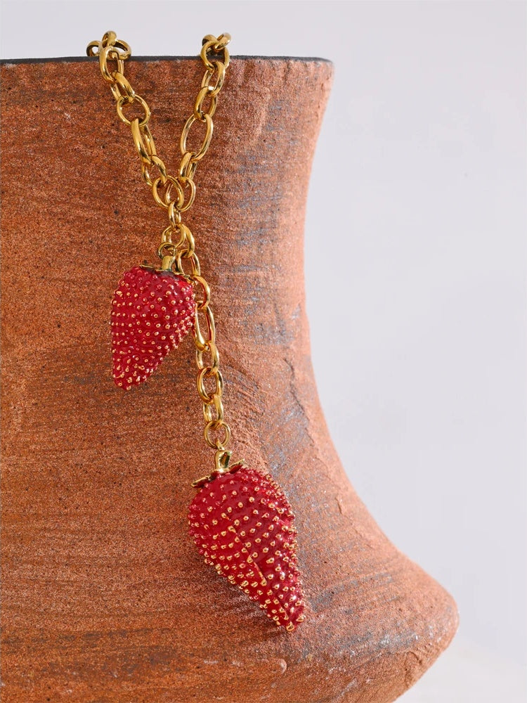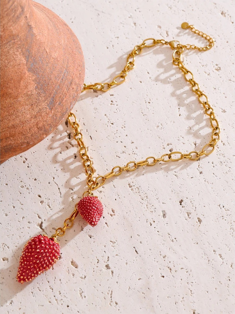 A charming pendant necklace featuring vibrant red strawberry-shaped charms crafted from stainless steel with a gold-plated finish. The detailed texture on each strawberry adds a playful yet elegant touch to the piece. Designed for durability and everyday wear, the necklace is water-resistant and suitable for all occasions. Its trendy geometric-inspired chain complements the unique pendant, making it a standout accessory for women.