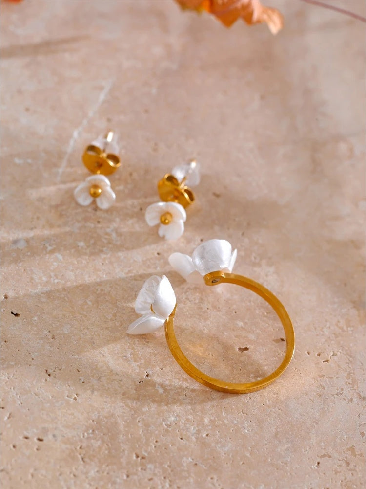 Featuring a charming floral design crafted from resin, this jewelry set includes a ring and matching earrings. The pieces are made with stainless steel and finished with a PVD real gold plating, ensuring durability and resistance to rust. Lightweight and waterproof, this set combines trendy style with everyday practicality, perfect for summer parties or casual outings.