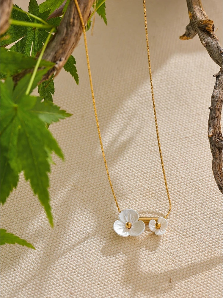 Crafted from stainless steel with a PVD real gold plating, this necklace features a delicate pendant adorned with two translucent resin flowers. The minimalist design combines geometric shapes with a chic floral motif, offering a trendy and elegant accessory for summer wear. Lightweight and compatible with any outfit, it serves as a stylish collar necklace perfect for gifting.