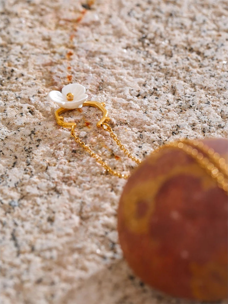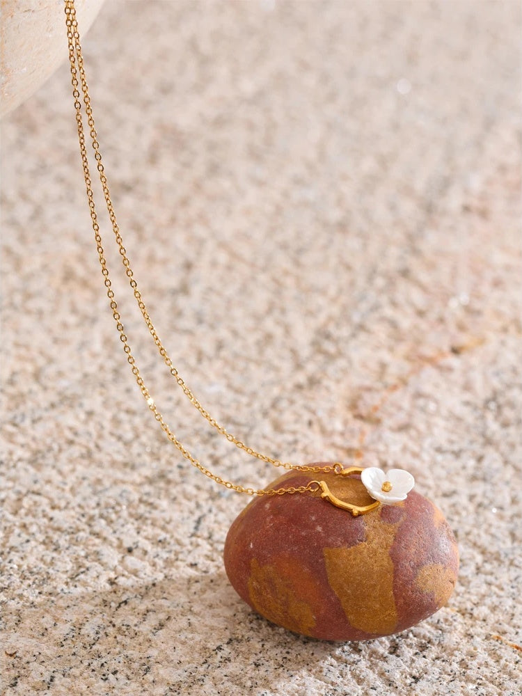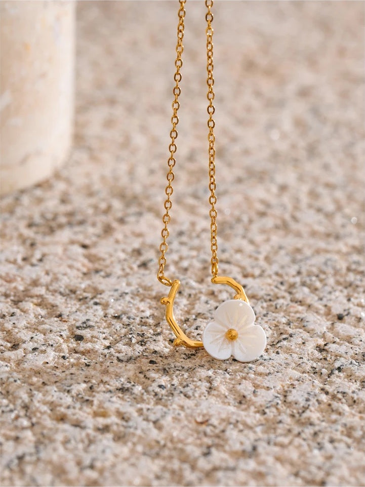 A delicate necklace featuring a resin flower pendant suspended from a gold-toned stainless steel branch-inspired frame. The pendant rests gracefully along the collarbone, making it an ideal accessory for daily wear in warmer seasons. Crafted with PVD real gold plating, it offers a fashionable and trendy look without compromising durability. The lightweight design ensures comfortable wear for extended periods.