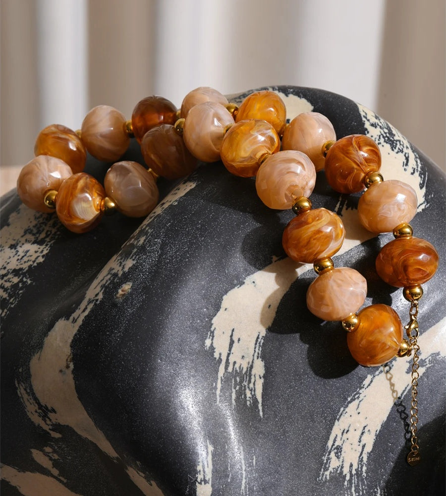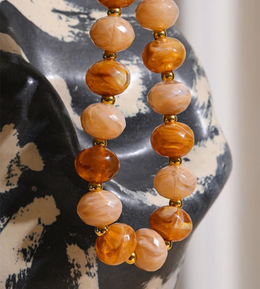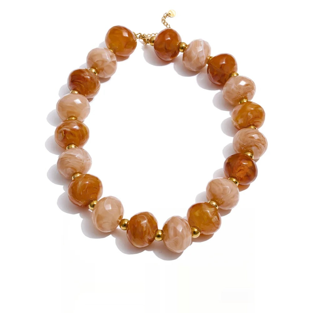 Handcrafted from resin, this round bead necklace features a warm blend of autumnal tones perfect for seasonal styling. The beads are interspersed with stainless steel elements finished in PVD real gold plating, adding a subtle shine and durability. Designed with a trendy geometric pattern, the necklace is lightweight, waterproof, and ideal for parties or casual wear. Adjustable chain length ensures a comfortable fit for all-day wear.