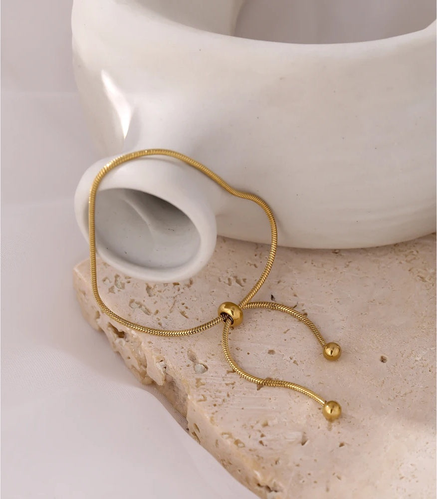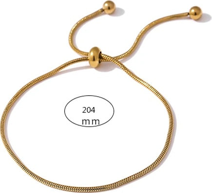 Featuring a sleek retractable design, this snake chain bracelet offers adjustable sizing for a perfect fit. Crafted from stainless steel with a real gold plating, it combines durability with a minimalist geometric style. The smooth, flexible chain provides comfortable wear, making it suitable for both everyday use and special occasions. Designed to complement a variety of looks, this bracelet adds a subtle, trendy accent to any wrist.