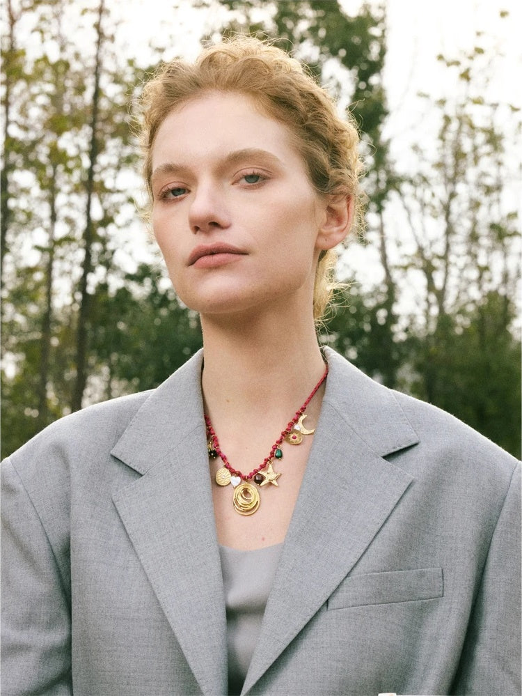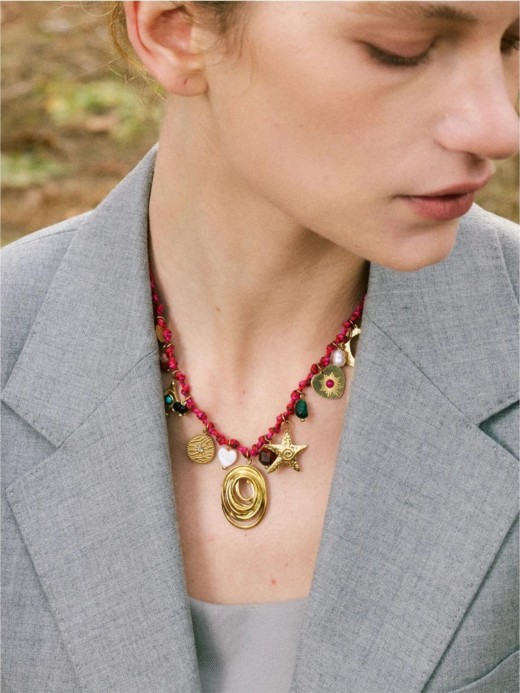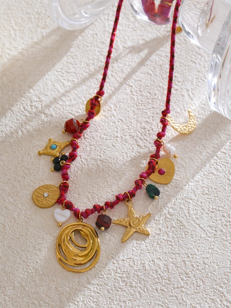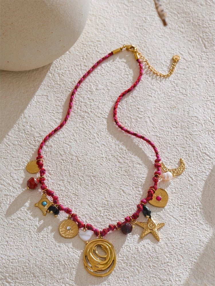 A handcrafted necklace featuring a vibrant rope braided cord adorned with a variety of natural stone charms and stainless steel pendants. The design includes crescent moon, star, and other celestial-inspired motifs with gold-toned finishes, creating a unique and trendy accessory. Lightweight and comfortable, it complements a wide range of styles and outfits. Perfect for those who appreciate artisanal jewelry with a distinctive, natural touch.