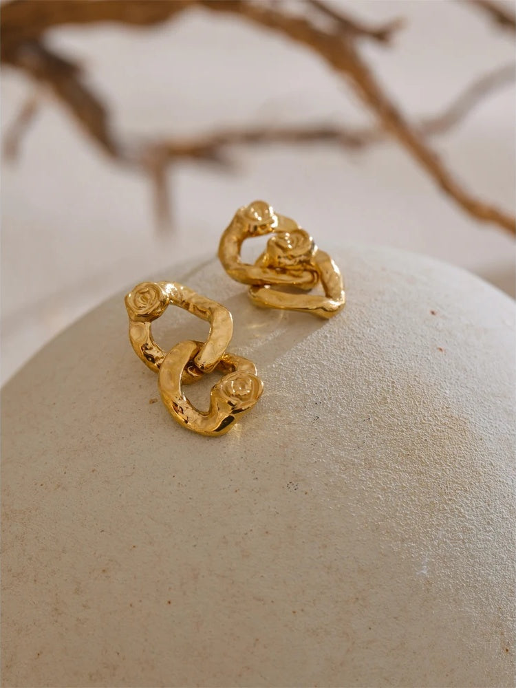 Elevate your everyday with these modern geometric drop earrings, thoughtfully crafted in durable stainless steel and finished with a PVD real gold plating. A delicate rose motif softens the clean angles, while the lightly hammered texture adds depth and an artisanal touch. Lightweight and designed for comfortable, day‑to‑night wear, these gold-plated earrings bring a refined edge to casual outfits and occasion looks alike.