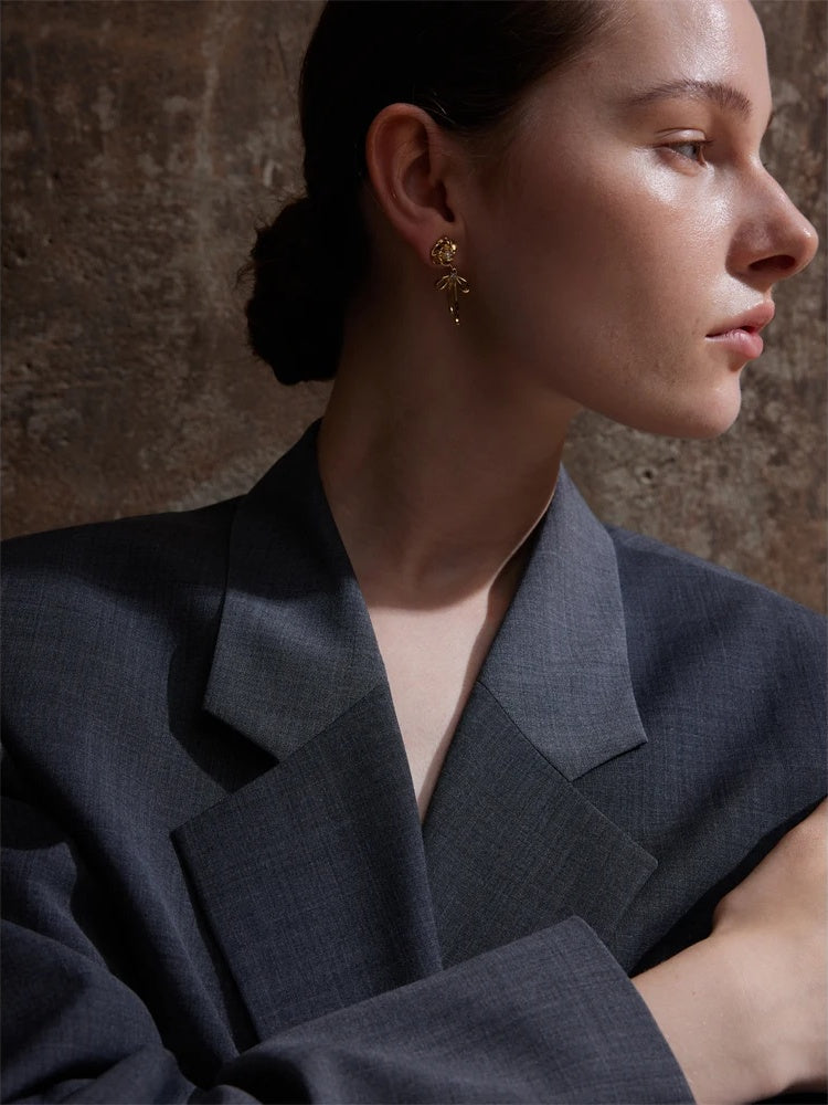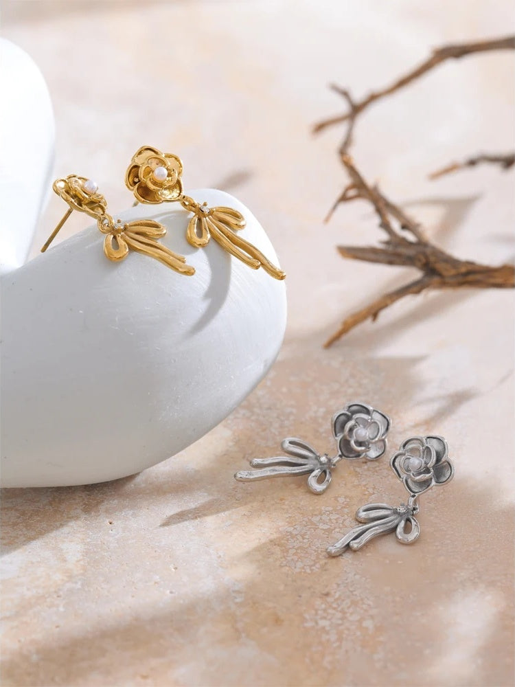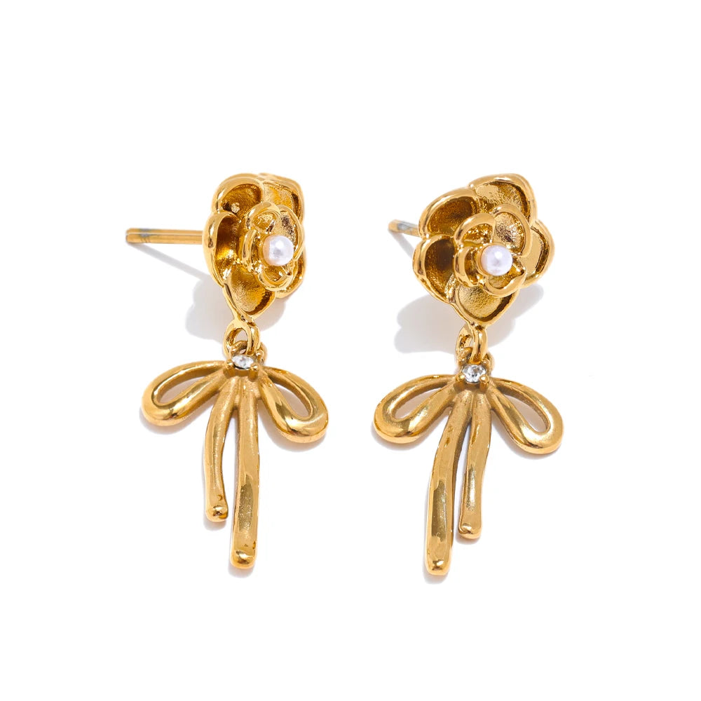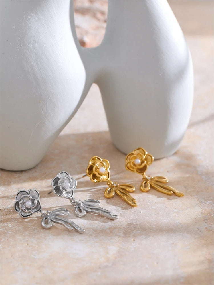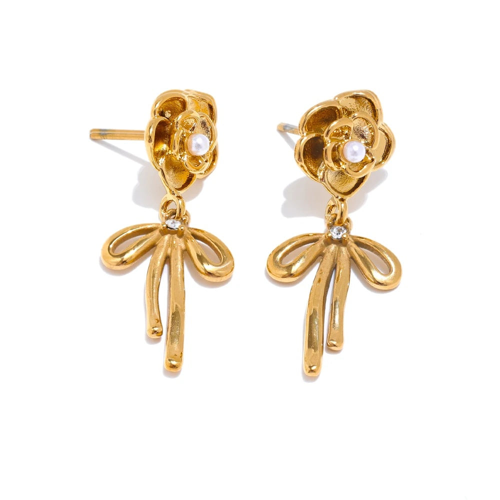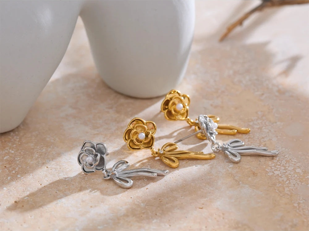 Romantic and refined, these gold-plated earrings bring a delicate flourish to your everyday style. Expertly crafted in stainless steel and finished with PVD real gold plating, each drop showcases a sculpted rose with a luminous simulated pearl center, while a graceful bowknot charm adds a playful, feminine touch.