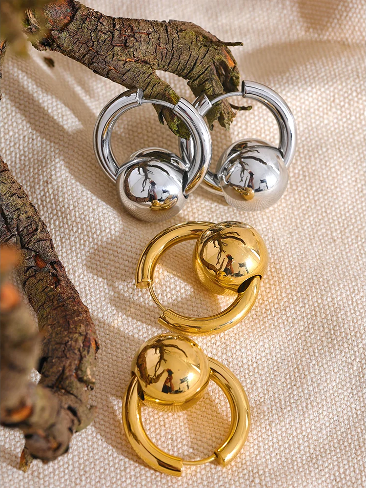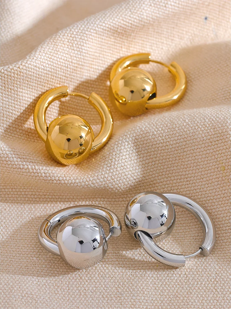 Crafted from durable 316L stainless steel with a 18K gold PVD plating, these hoop earrings showcase a smooth, polished finish and feature a striking round ball detail. Their waterproof design ensures lasting wear without tarnishing, making them suitable for everyday use. The geometric shape adds a modern edge, while the lightweight metal guarantees comfortable all-day wear. Suitable for a variety of styles, these earrings offer a trendy yet timeless accessory option.