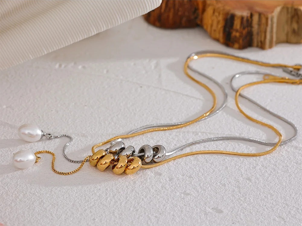 Featuring a delicate round bead chain crafted from stainless steel with a PVD real gold plating, this necklace combines durability with a polished finish. The design includes a drop pendant with a single simulated pearl that adds subtle elegance and geometric charm. Lightweight and hypoallergenic, it is suitable for everyday wear and complements a variety of styles. Perfect for those seeking trendy yet timeless jewelry pieces.