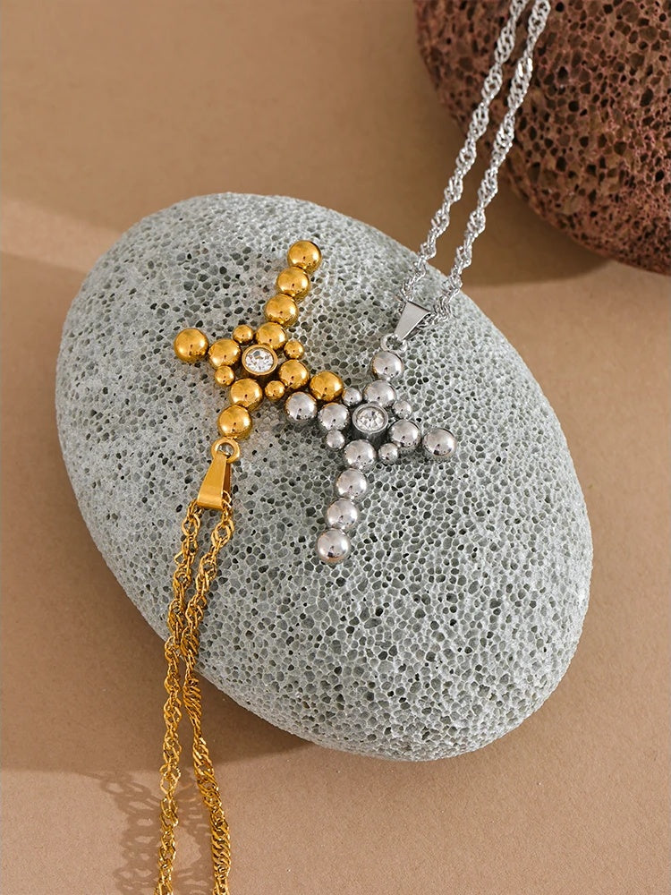 A modern take on meaningful style. This stainless steel cross necklace features a distinctive beaded silhouette—polished round beads form the pendant’s arms—finished with premium PVD real gold plating for a rich, lasting glow. A single cubic zirconia sits at the center, adding refined sparkle without overpowering the design. Built with water-resistant materials for everyday wear, it’s a sleek unisex piece that moves effortlessly from casual to dressed-up looks.
