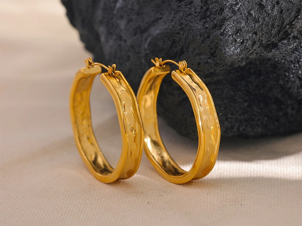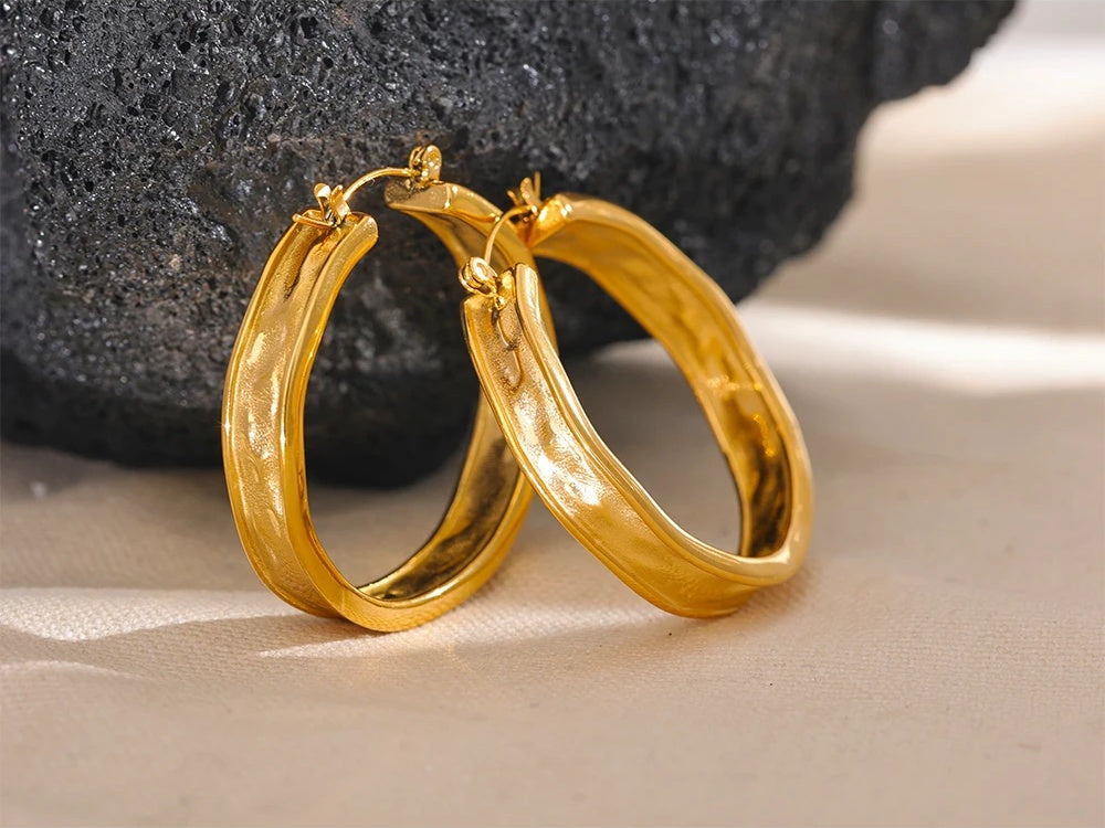 Crafted from durable 316L stainless steel, these 42mm hoop earrings feature a bold round shape with a smooth, polished finish. The PVD gold plating adds a rich, lustrous tone that resists tarnishing and maintains its shine over time. Designed with a minimalist and geometric style, they offer a trendy yet versatile accessory suitable for everyday wear or special occasions. The secure clasp ensures comfortable and reliable wear throughout the day.