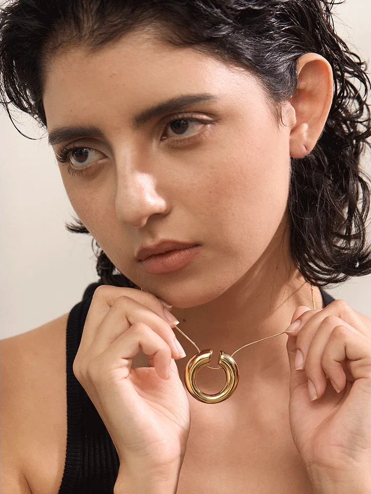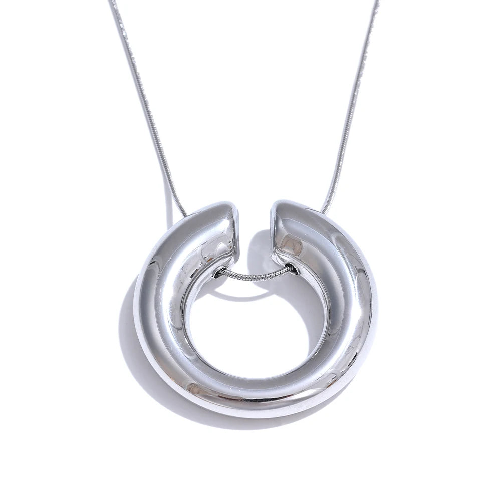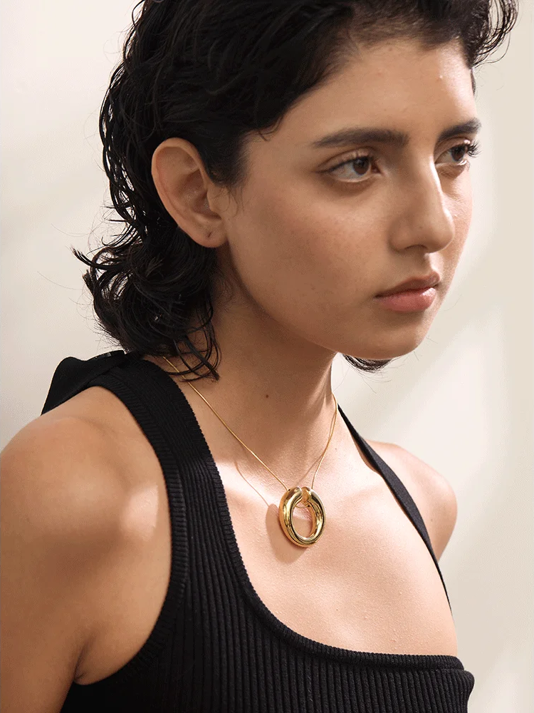 Crafted from durable stainless steel with an 18K PVD plating, this pendant necklace features a distinctive round chain crossover design that complements a variety of outfits. Its waterproof finish ensures lasting shine and resilience for daily wear. The necklace offers a versatile style suitable for any occasion, combining modern trends with lasting quality. Available in sleek platinum or classic gold tones to match personal preferences.