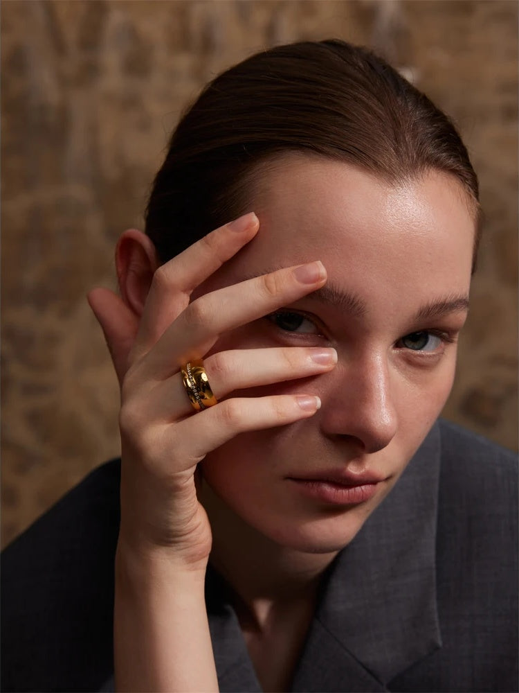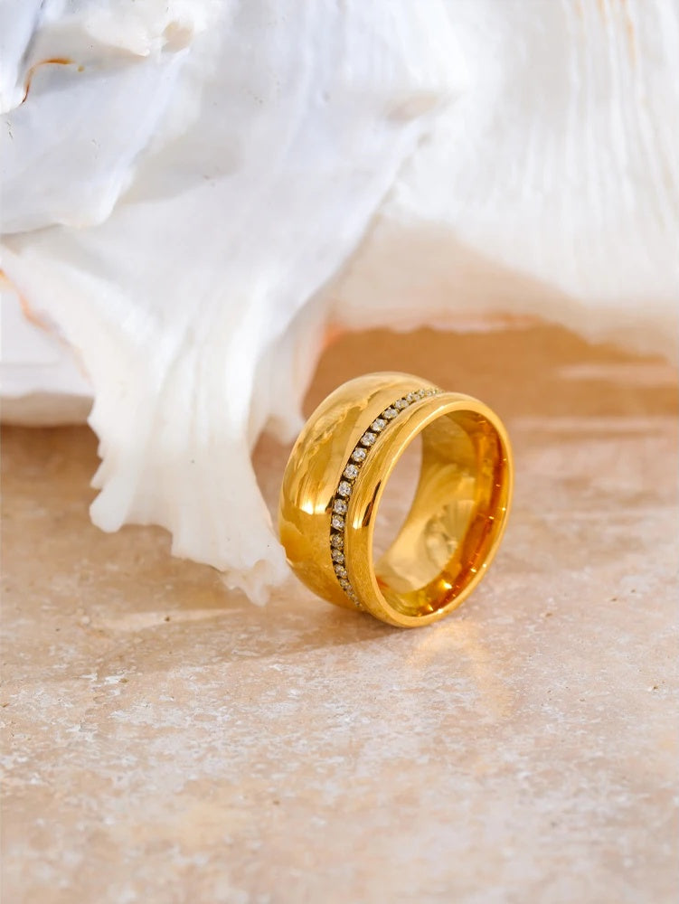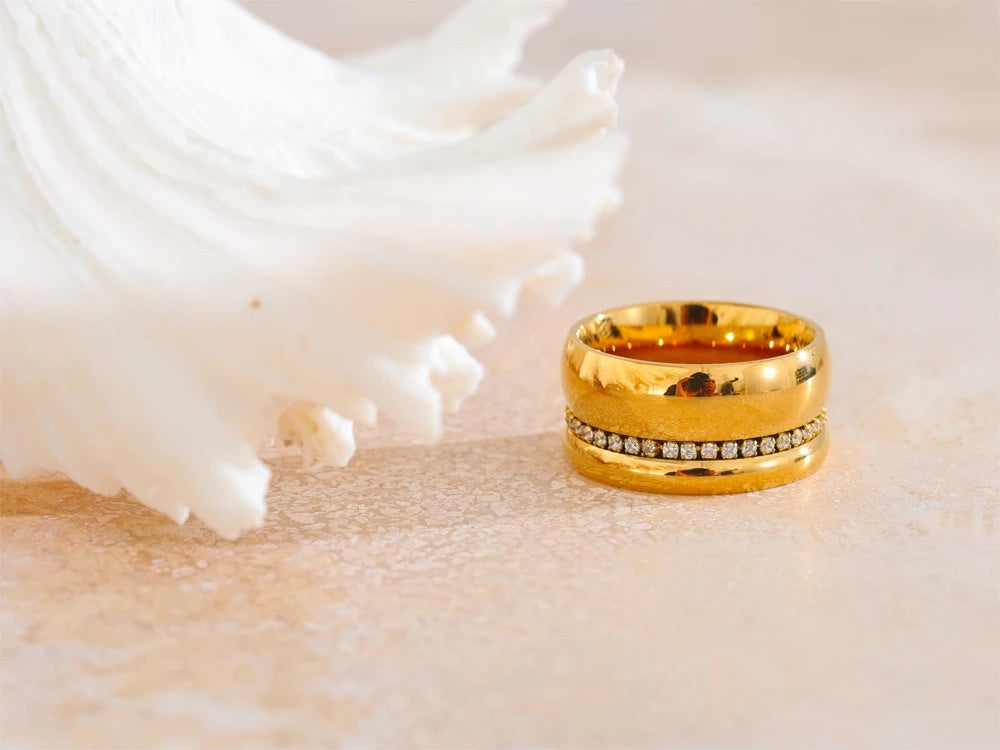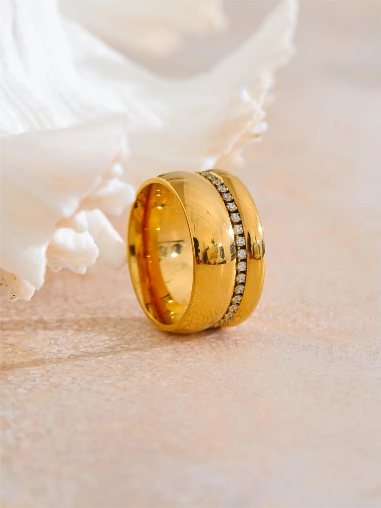 Crafted from durable stainless steel with 18K PVD gold plating, this wide ring features a sleek geometric design accented by a row of sparkling cubic zirconia stones. The tension mount setting enhances the brilliance of the stones while maintaining a smooth, comfortable fit. Suitable for all occasions, its polished finish and trendy style make it a standout accessory for any outfit. Available in multiple sizes to ensure the perfect fit.