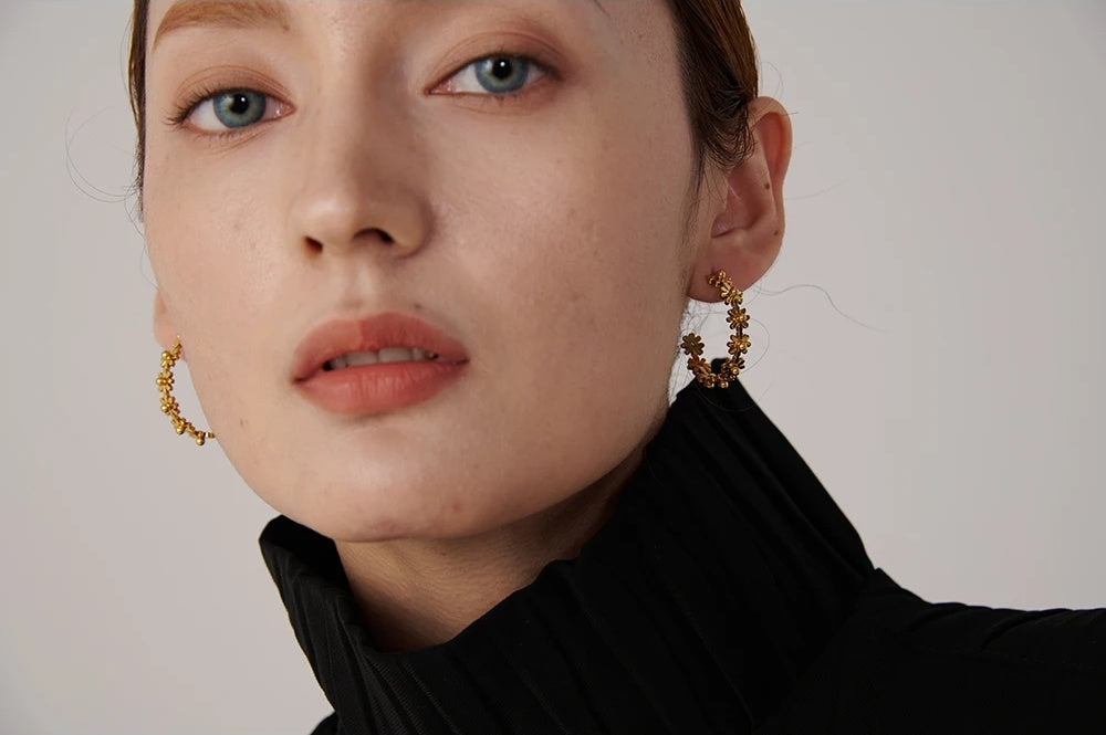 Crafted from durable stainless steel with a real gold plating, these hoop earrings feature a charming floral design that adds a playful yet elegant touch. The round shape is adorned with intricately detailed flowers, creating a textured and trendy look. Lightweight and waterproof, they are ideal for everyday wear or special occasions. Designed to complement a variety of styles, these earrings offer both fashion and comfort for women.