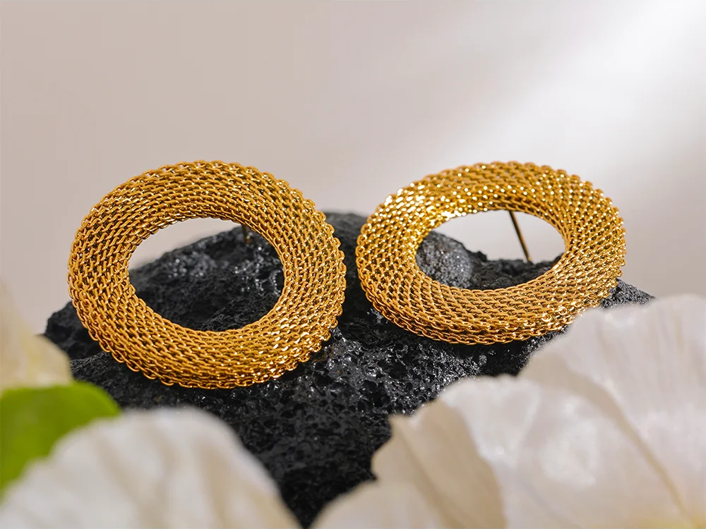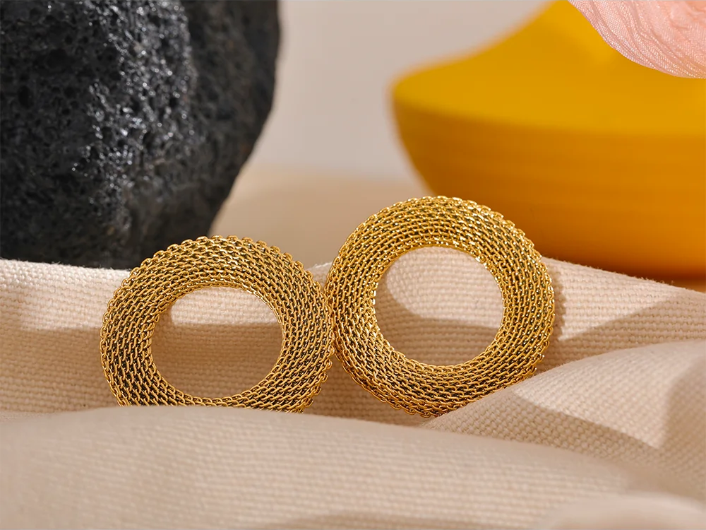 Crafted from rust-proof stainless steel with a PVD real gold plated finish, these round hollow stud earrings offer a bold, geometric design. Measuring 37mm in diameter, they provide a statement look while remaining lightweight and comfortable to wear. The push-back fastening ensures secure and easy wear, making them a versatile accessory for various occasions.
