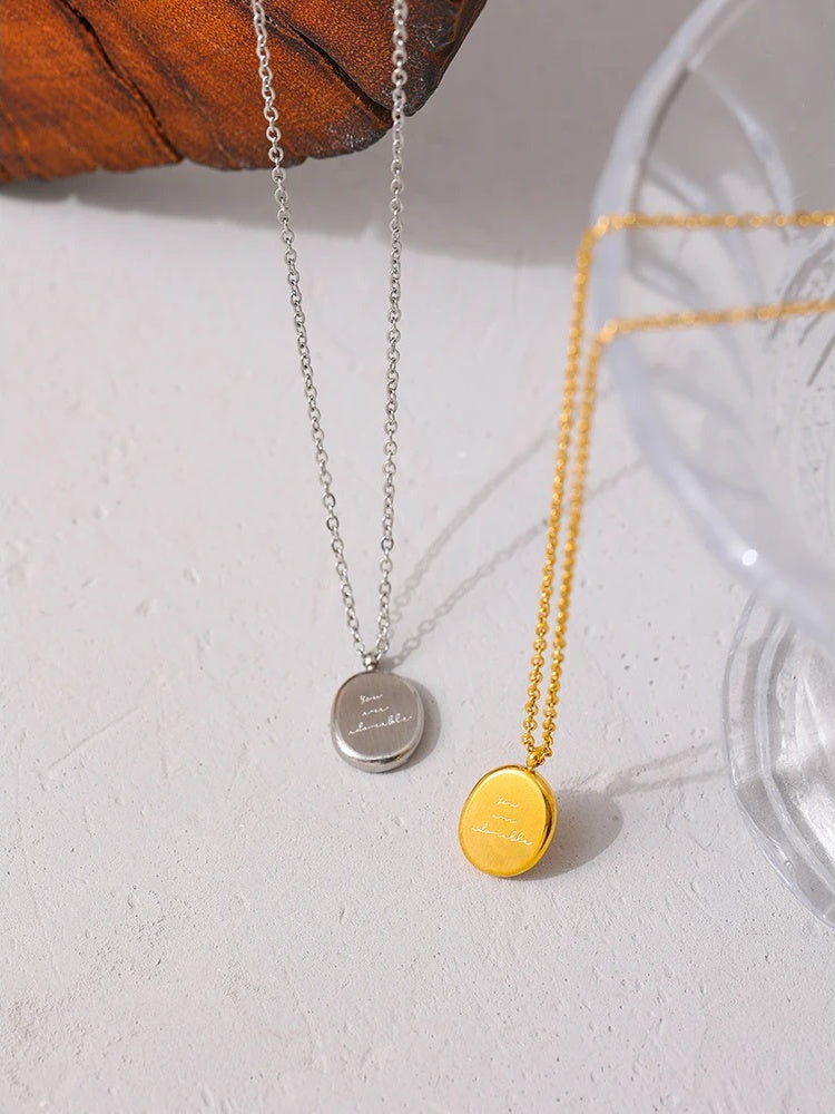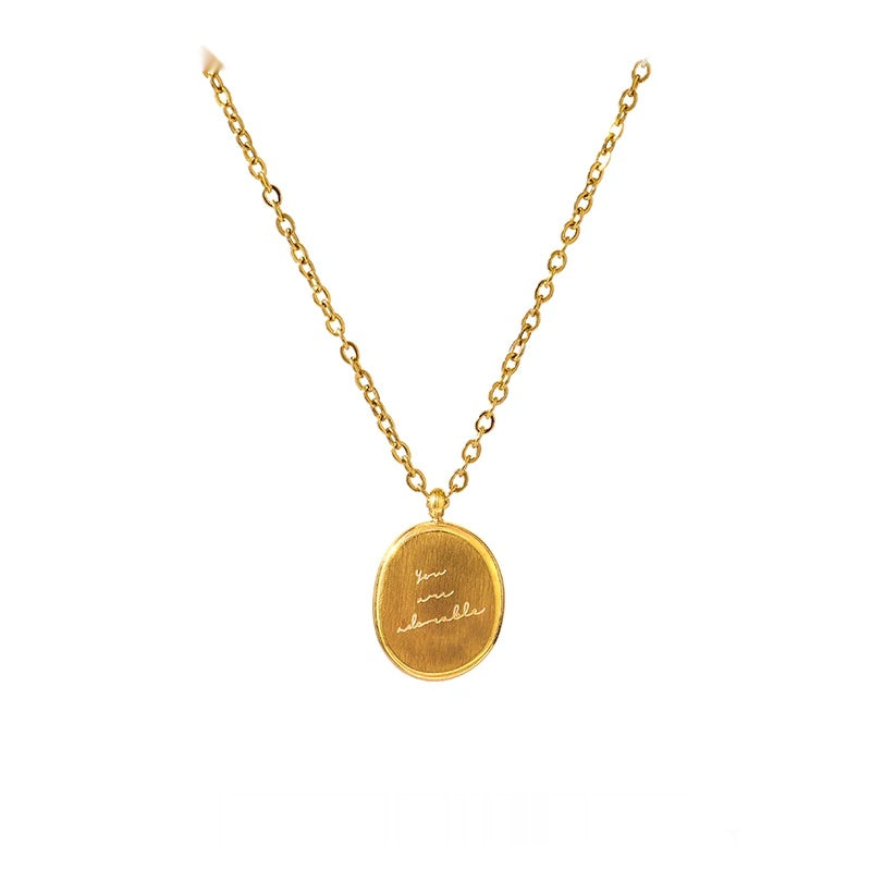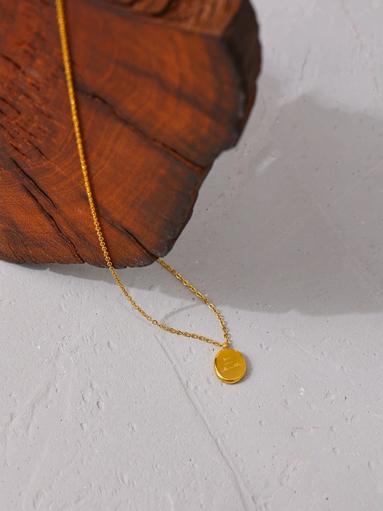 Crafted from durable stainless steel with a PVD real gold plating option, this pendant necklace offers both style and lasting quality. The round geometric pendant features delicate engraved script, creating a subtle statement piece that complements a variety of outfits. Designed with a trendy collar length, it provides a comfortable fit suitable for everyday wear. Resistant to high-concern chemicals, this necklace maintains its shine and elegance over time.