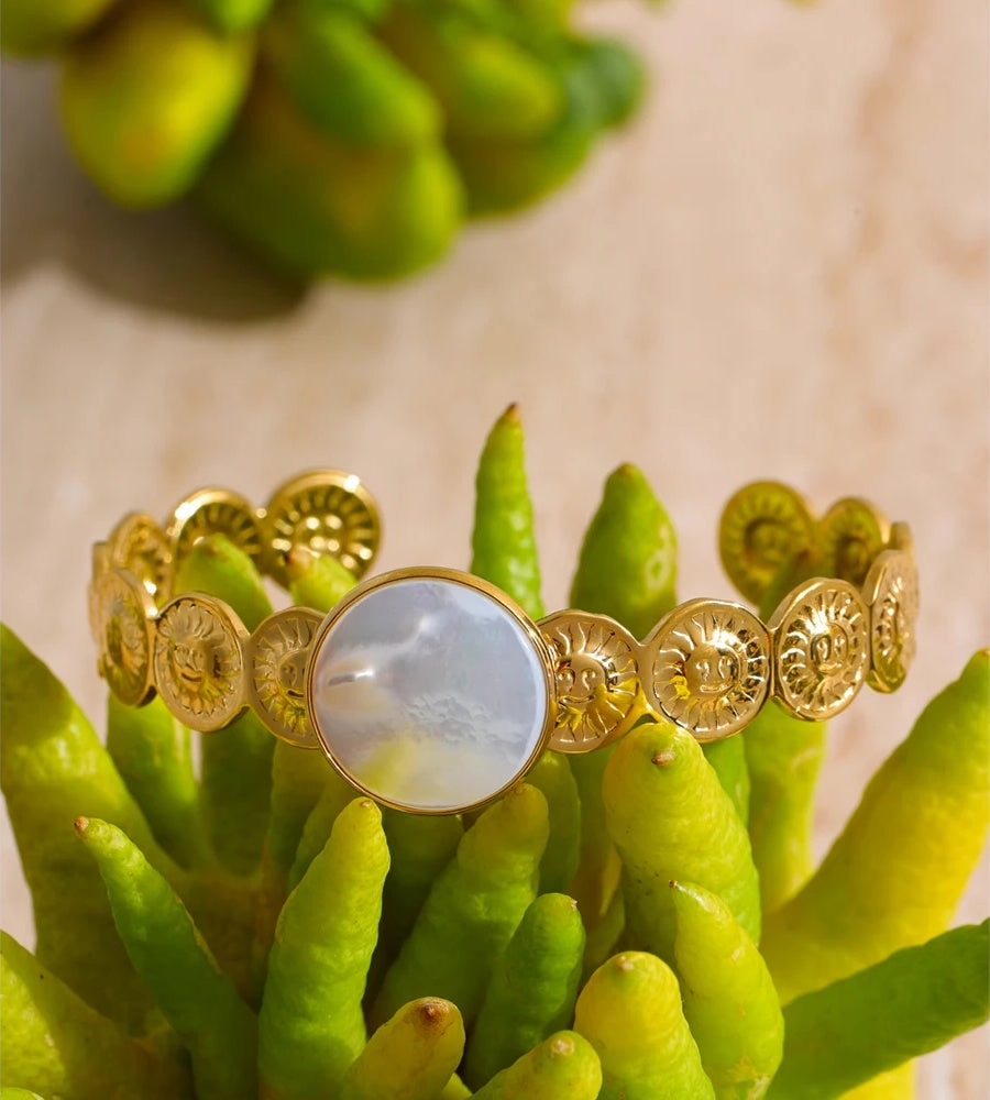 Crafted from stainless steel with a polished gold-tone finish, this cuff bracelet features a series of sun motifs encircling the band. A round shell centerpiece adds a touch of natural elegance, creating a balanced contrast with the metallic elements. The open cuff design allows for easy adjustment and comfortable wear, while the tarnish-resistant plating ensures long-lasting shine. Suitable for all occasions, this accessory complements a variety of styles with its trendy and unique appearance.