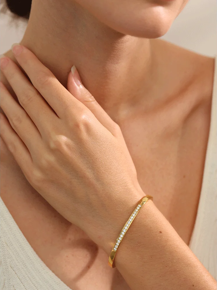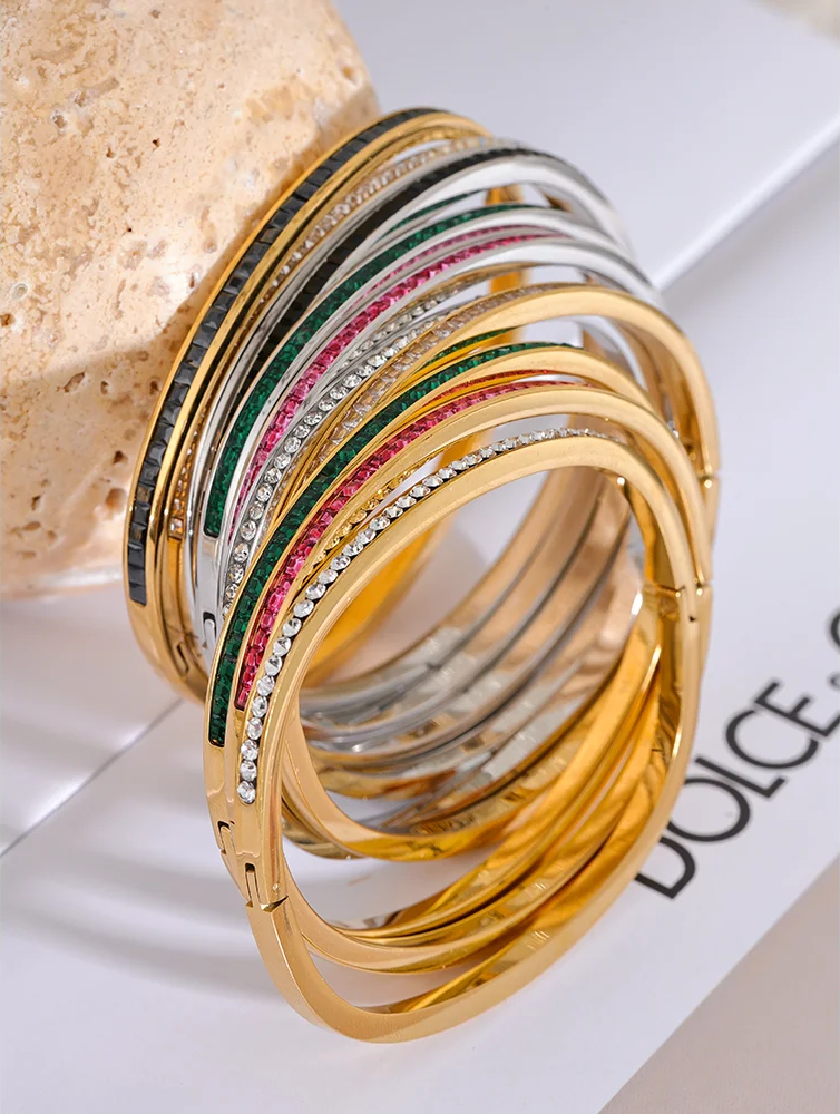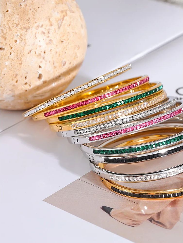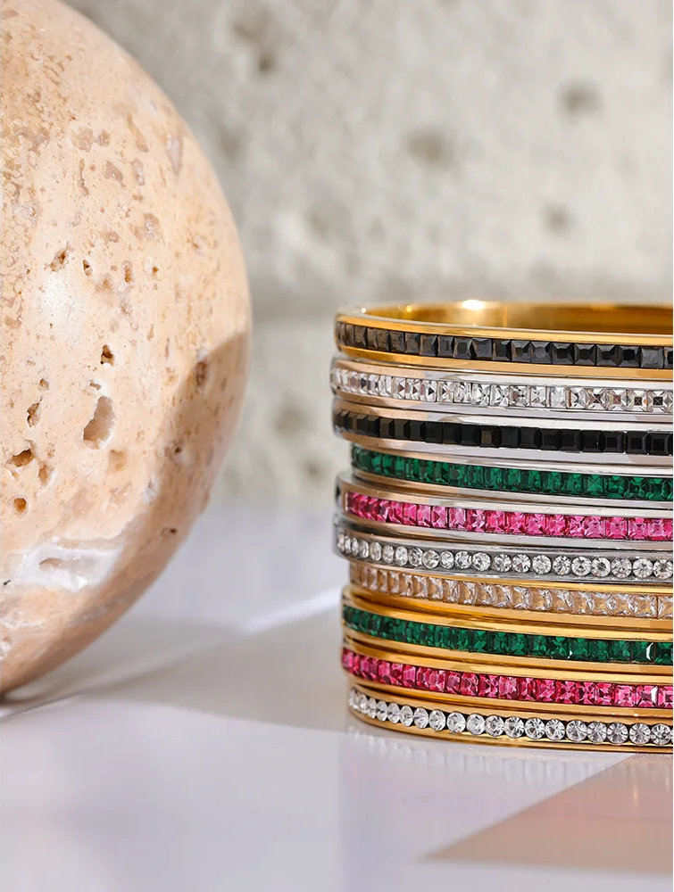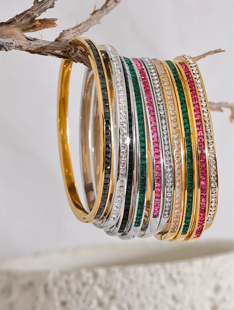 Crafted from stainless steel with a gold-color plating, these bangles feature a striking geometric design with round and square cubic zirconia stones. The tension mount setting securely holds the colorful stones, creating a vibrant and fashionable look. Designed for women, the bracelets offer compatibility with all styles and occasions, making them a versatile addition to any jewelry collection. Available in multiple color options, these bangles combine durability with eye-catching sparkle.