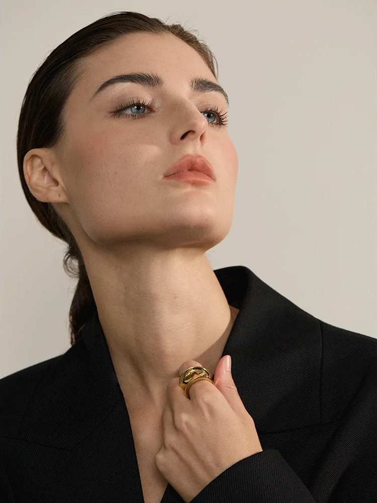 Versatile and easy to style, this 18k gold-plated ring pairs beautifully with minimalist looks, adds a sculptural edge to office attire, and complements evening outfits. Wear it solo for a refined, modern statement or stack alongside slim bands to create contrast and dimension in your jewelry rotation.