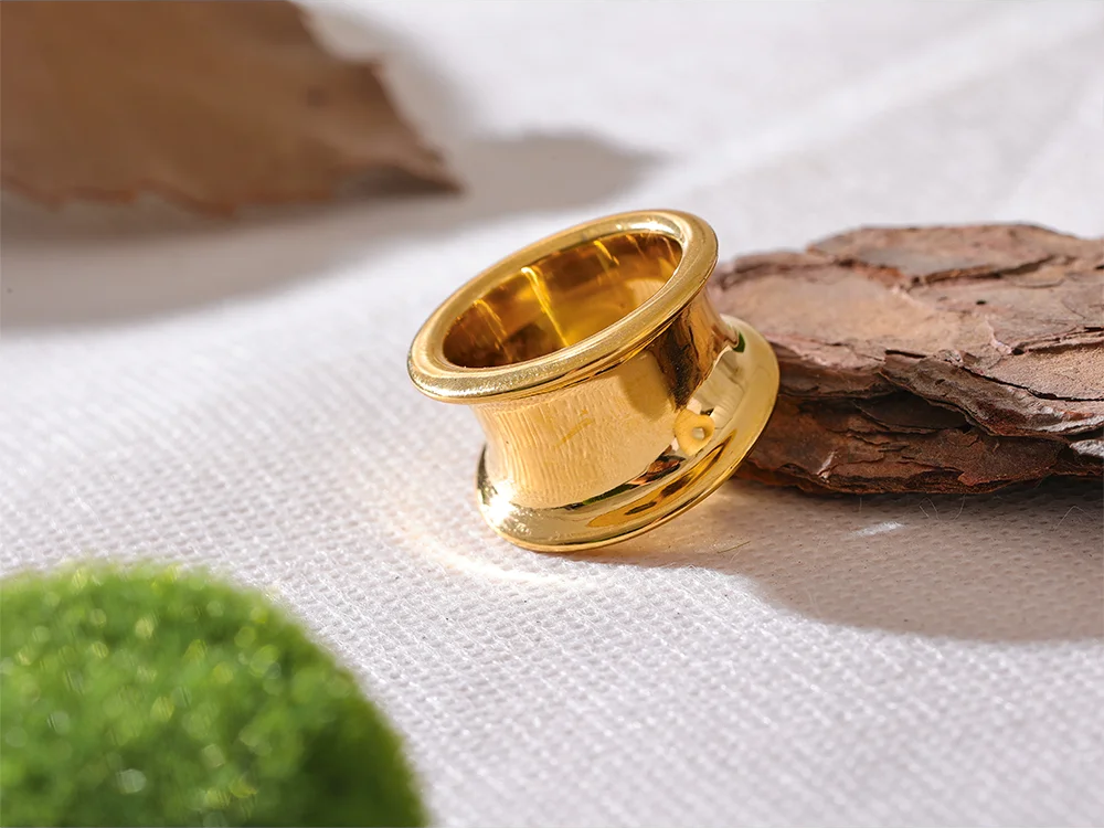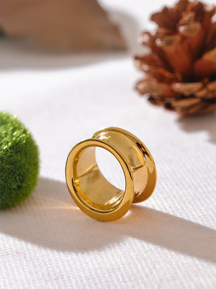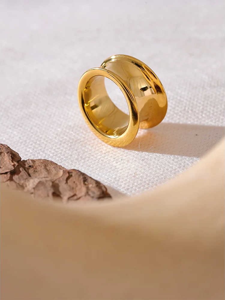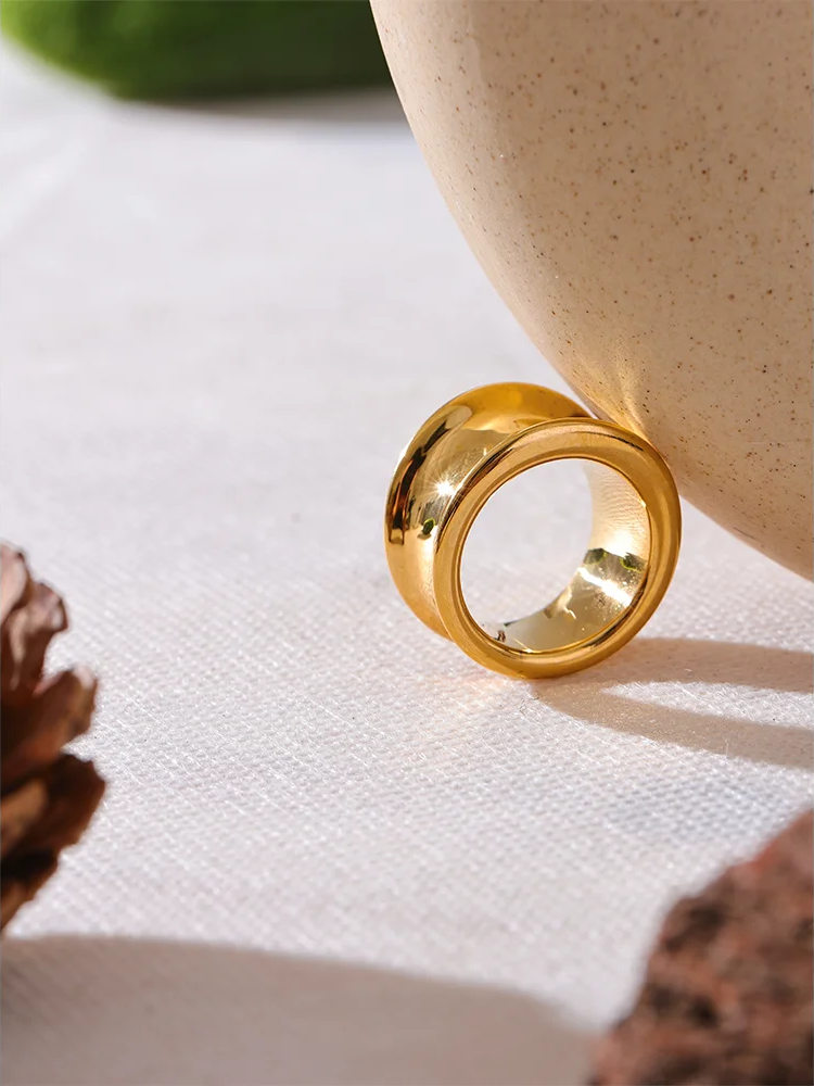 Elevate your everyday with a modern statement ring that balances bold design and effortless wear. This wide band features a smooth, curved profile and a high-polish finish for a refined, geometric silhouette. Crafted with a durable stainless-steel core and plated in 18k gold, it delivers contemporary style with lasting quality—lightweight enough for all-day comfort and striking enough to stand alone.