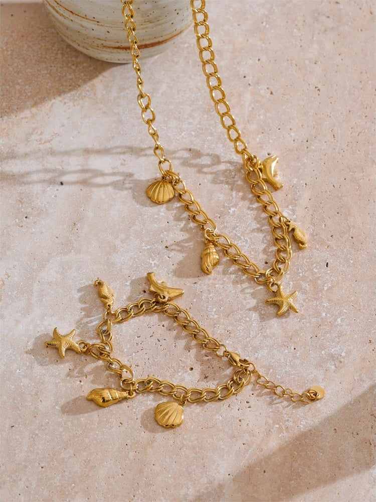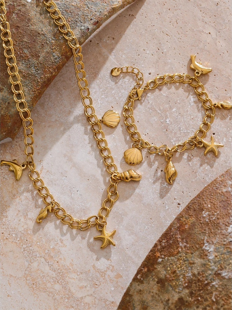 Crafted from stainless steel with a PVD real gold plating, this jewelry set features a necklace and bracelet adorned with intricate seashell, conch, starfish, and seahorse charms. The set offers a trendy geometric design that complements summer and daily wear, with a waterproof finish for durability. Perfect for parties or casual outings, it combines fashion-forward style with lasting quality. Adjustable chain lengths provide a comfortable fit for various wrist and neck sizes.