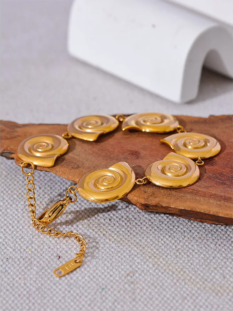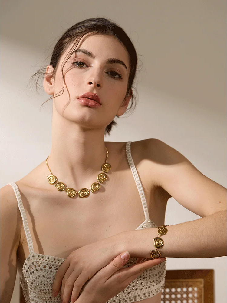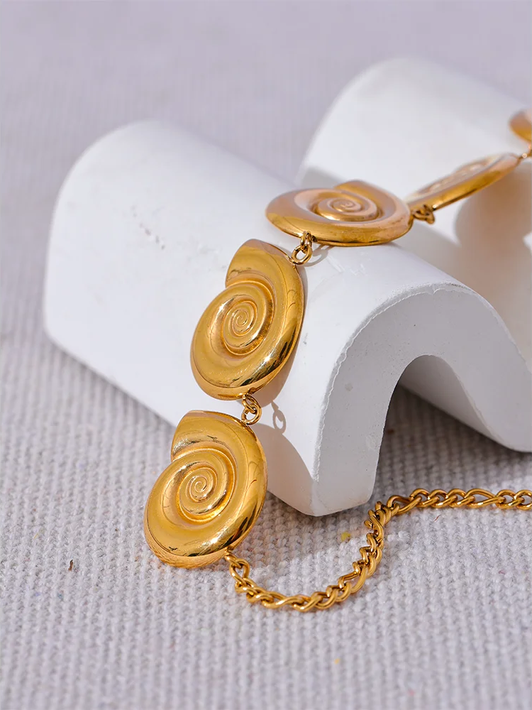 Refine your look with a modern classic. This gold-plated jewelry set pairs a statement shell chain necklace with a coordinating bracelet, each showcasing a sculptural, geometric spiral pattern that catches the light from every angle. Crafted in durable stainless steel and finished with 18K gold plating, it delivers a luminous glow with water- and tarnish-resistant wear—ready for everyday styling and special events alike.