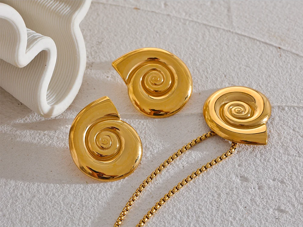 Crafted from durable stainless steel with a high-quality 18K gold PVD plating, this shell conch snail pendant necklace and earrings set offers a stylish and trendy geometric design. The polished finish provides a waterproof surface that maintains its shine and resists tarnish. Ideal for party wear, the set combines modern fashion with lasting durability, making it a versatile addition to any jewelry collection.