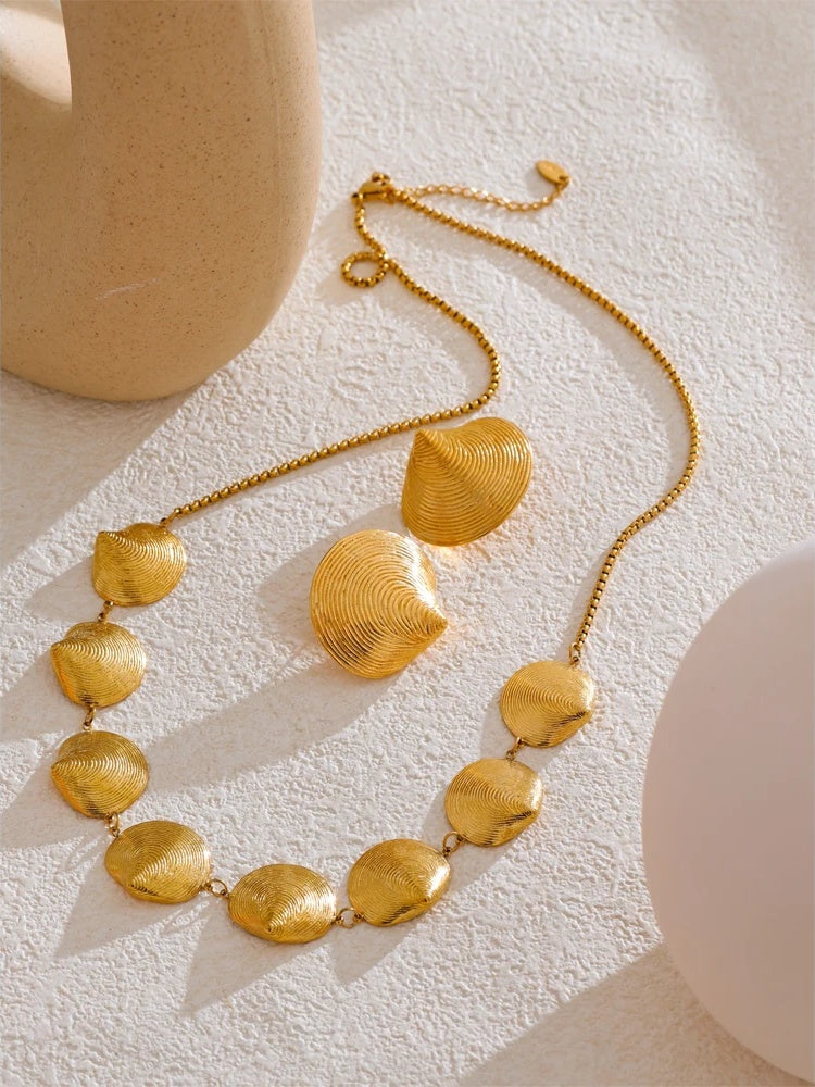 Make a modern statement with this geometric shell jewelry set—an elegant pairing of a pendant necklace and matching gold-plated earrings designed for effortless, everyday shine. Crafted from durable stainless steel and finished with real gold PVD plating, each piece delivers a polished glow that stands up to daily wear.