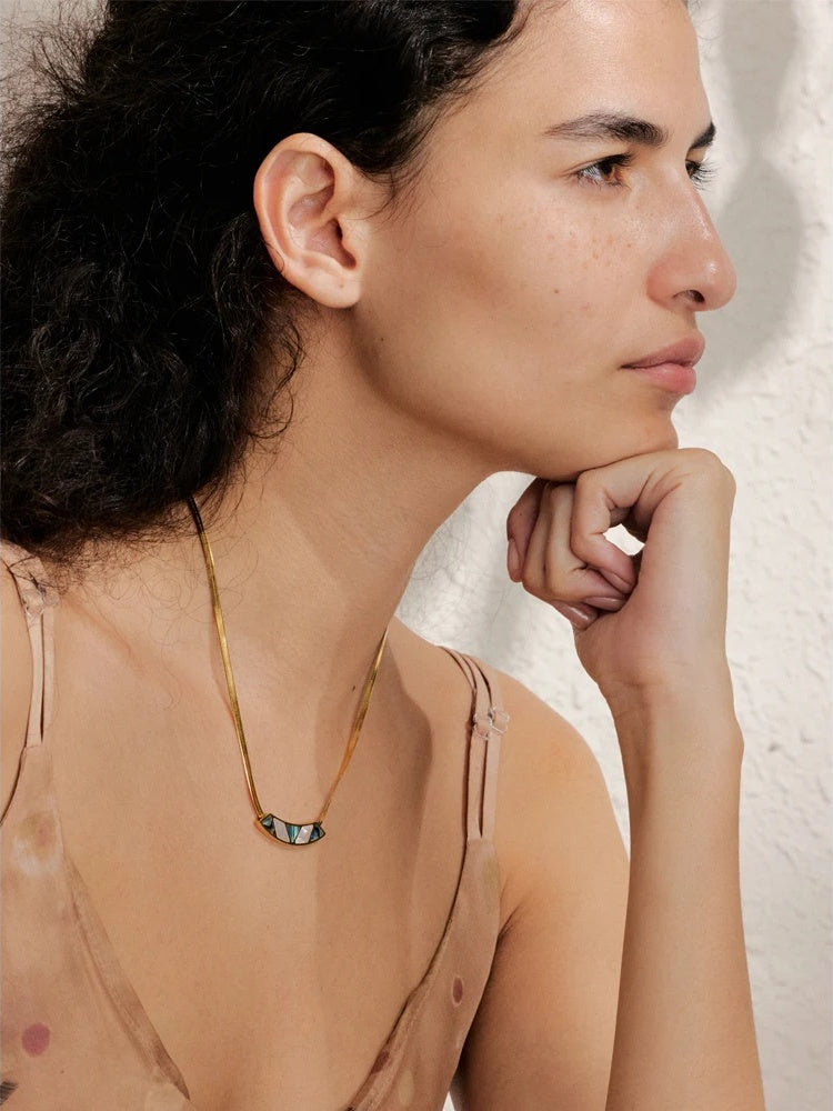 Featuring a sleek snake chain design crafted from durable stainless steel, this collar necklace combines minimalist elegance with geometric shell inlays. The pendant is enhanced with a PVD real gold plating that offers a lasting, water-resistant finish. Lightweight and comfortable, it’s designed for all-day wear and pairs effortlessly with a variety of styles. Perfect as a statement piece or a subtle accent to any outfit.
