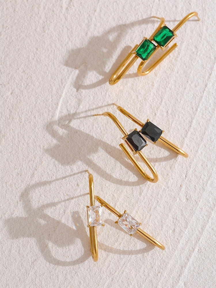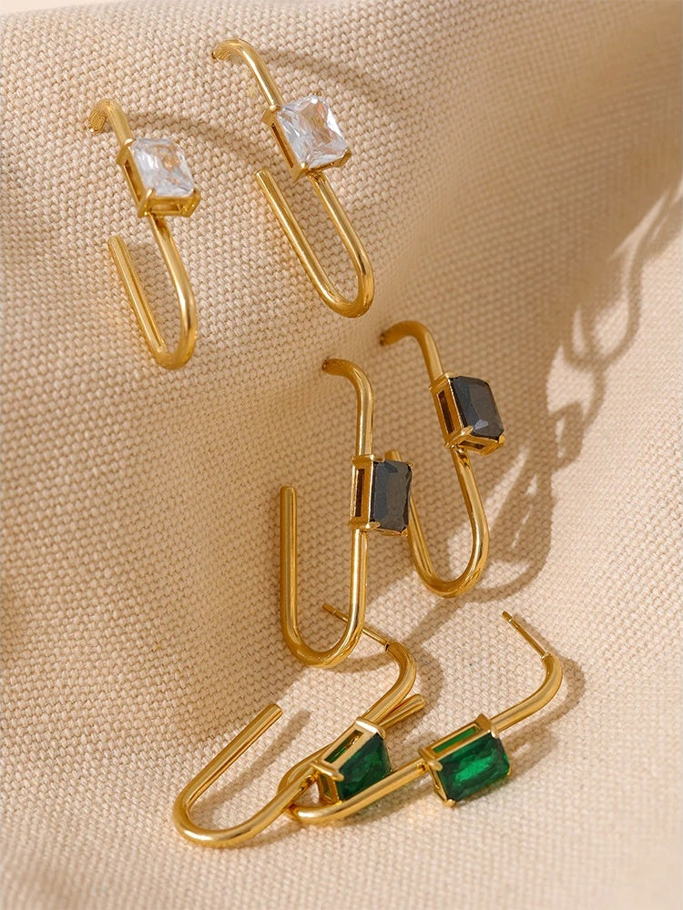 Crafted from stainless steel with an 18K gold plating, these drop earrings feature a sleek geometric design enhanced by a sparkling cubic zirconia stone. The polished finish adds a refined shine, while the abstract shape offers a modern and trendy look. Lightweight and comfortable, they are suitable for everyday wear or special occasions. Available in multiple color options to complement various styles.