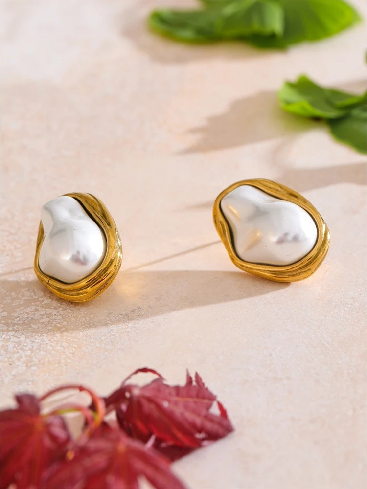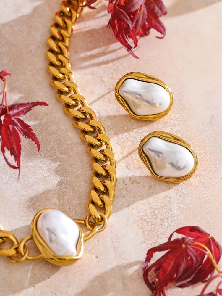 A striking jewelry set featuring a bold Cuban chain necklace paired with matching earrings, each adorned with uniquely shaped simulated baroque pearls. Crafted from stainless steel with a PVD real gold plating, the set offers a durable, high-quality finish. The geometric design of the pearls provides a contemporary twist on classic elegance, making it suitable for parties and special occasions. This versatile set combines trendy fashion with lasting wearability.