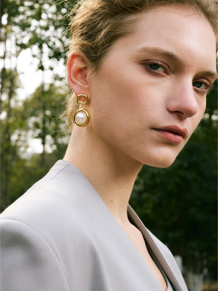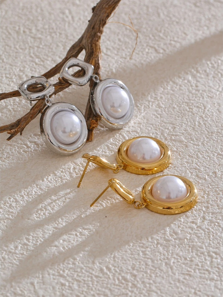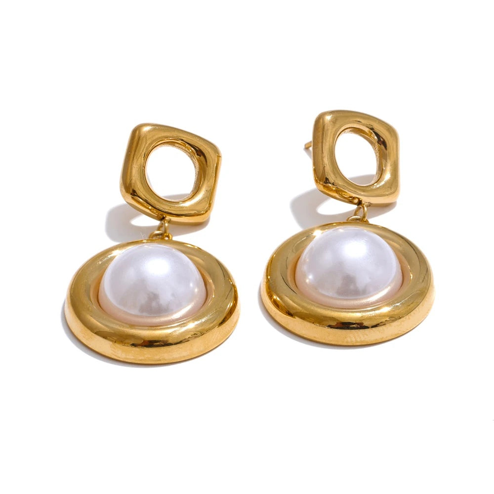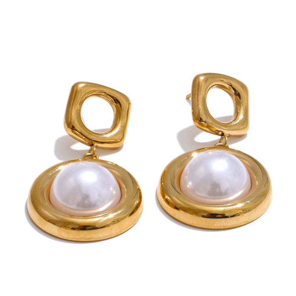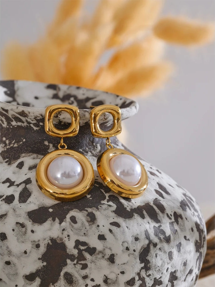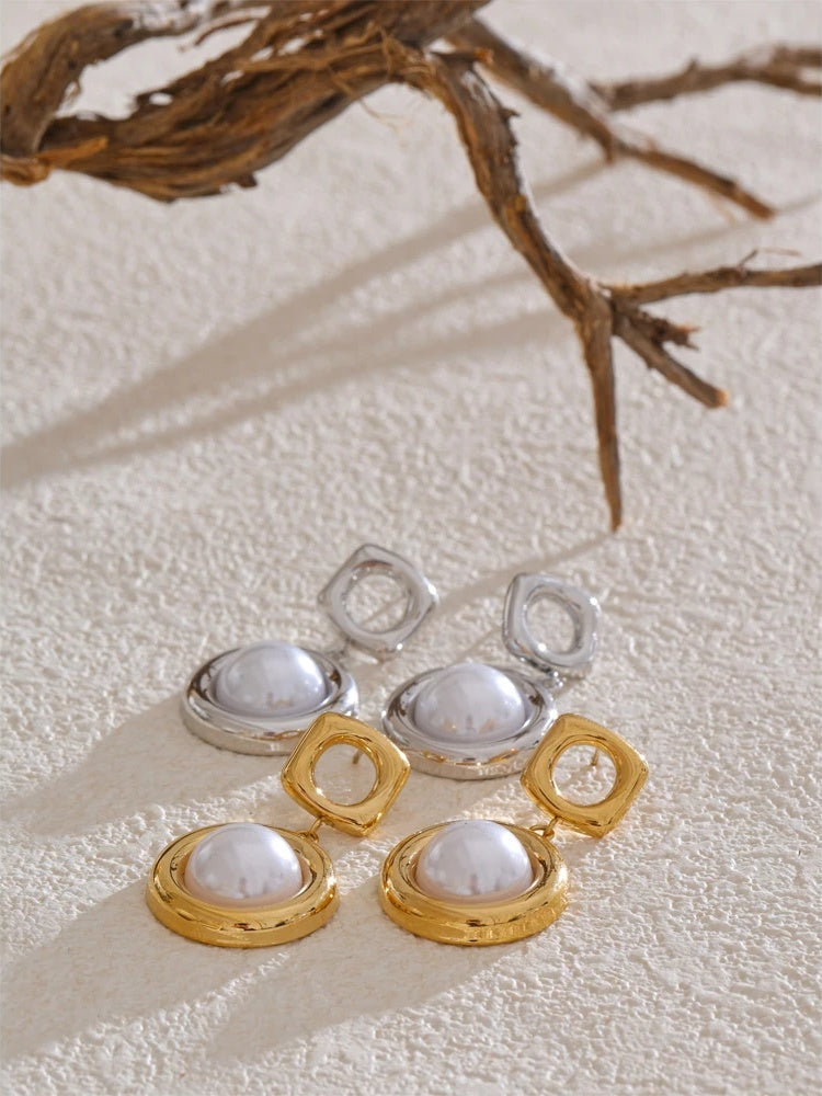 Clean lines meet soft luster in these geometric drop earrings. A smooth round simulated pearl floats inside a polished frame, creating a modern silhouette that catches the light without overpowering your look. Crafted from high-quality stainless steel and finished with PVD real gold plating, these gold-plated earrings offer lasting shine, everyday durability, and a refined, contemporary feel.