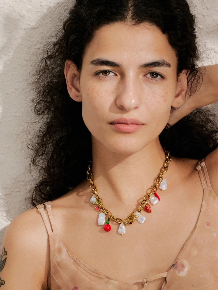 Featuring a playful mix of simulated pearls and vibrant fruit charms, this jewelry set includes a necklace and bracelet crafted from stainless steel with a PVD real gold plating for lasting shine. The geometric shapes of the pearls complement the colorful red strawberry, cherry, and other fruit accents, creating a trendy and eye-catching design. Lightweight and comfortable, both pieces are perfect for party wear or adding a fun, stylish element to your everyday look. The handmade construction ensures unique detailing for an artisanal touch.