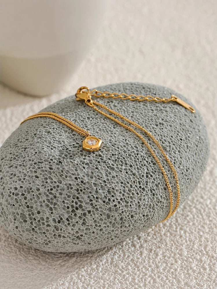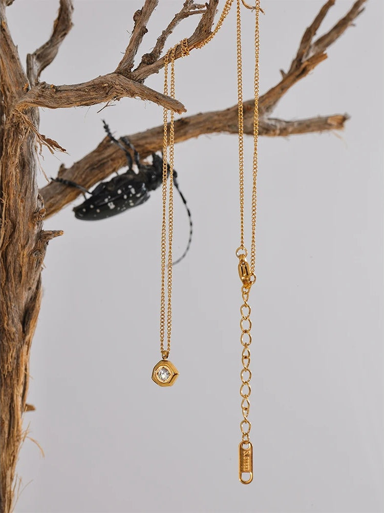 Elevate your everyday look with this minimalist pendant necklace from Hoops & Gems. Crafted in durable 316L stainless steel with a polished gold-tone finish, it features a sleek geometric silhouette set with a sparkling cubic zirconia—perfect for those who love dainty gemstone jewelry with a modern edge.