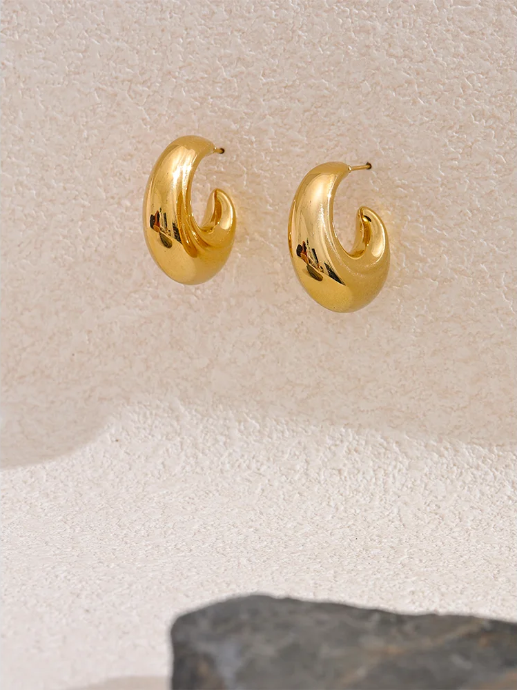 Chunky C-shape hoop earrings crafted from smooth stainless steel with an 18K gold plating offer a bold statement piece for any fashion-forward wardrobe. The geometric design highlights a modern silhouette while maintaining a polished and waterproof finish for everyday wear. Lightweight and comfortable, these earrings combine durability with trend-right appeal. Available in gold or platinum tones to complement a variety of styles.
