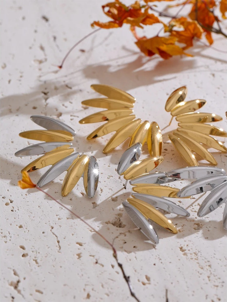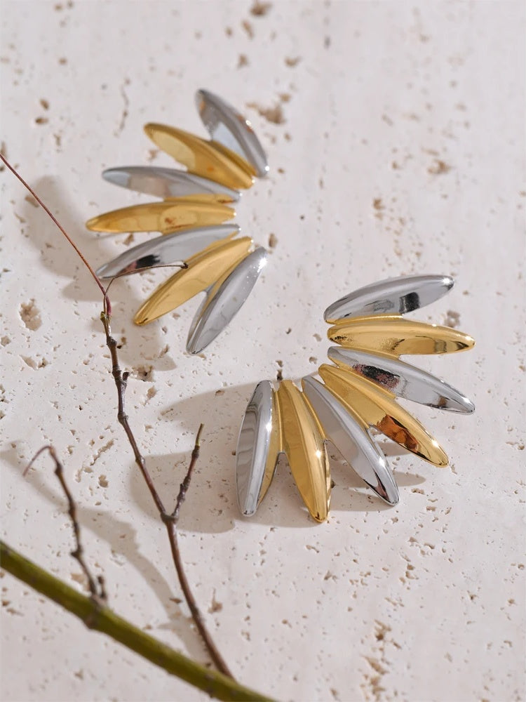 Crafted from smooth stainless steel with a high-quality PVD real gold plating, these geometric stud earrings offer a modern and trendy look. The unique design features alternating polished metal shapes in gold and platinum tones for a striking visual effect. Lightweight and comfortable, they secure easily with push-back fittings. Ideal for adding a bold, distinctive touch to any outfit.