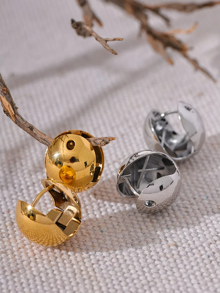 Smooth round hollow hoop earrings crafted from stainless steel with an 18K real gold plating offer a sleek, polished finish. Their hollow design ensures a lightweight feel for comfortable all-day wear, while the secure clasp adds practicality. These trendy metal earrings provide a bold yet elegant statement for a variety of occasions.