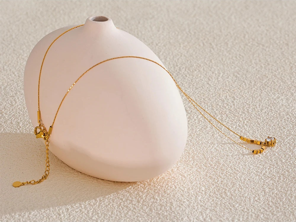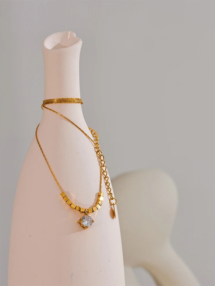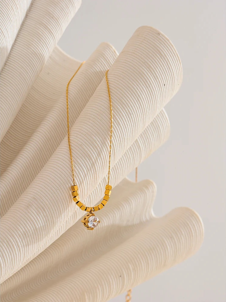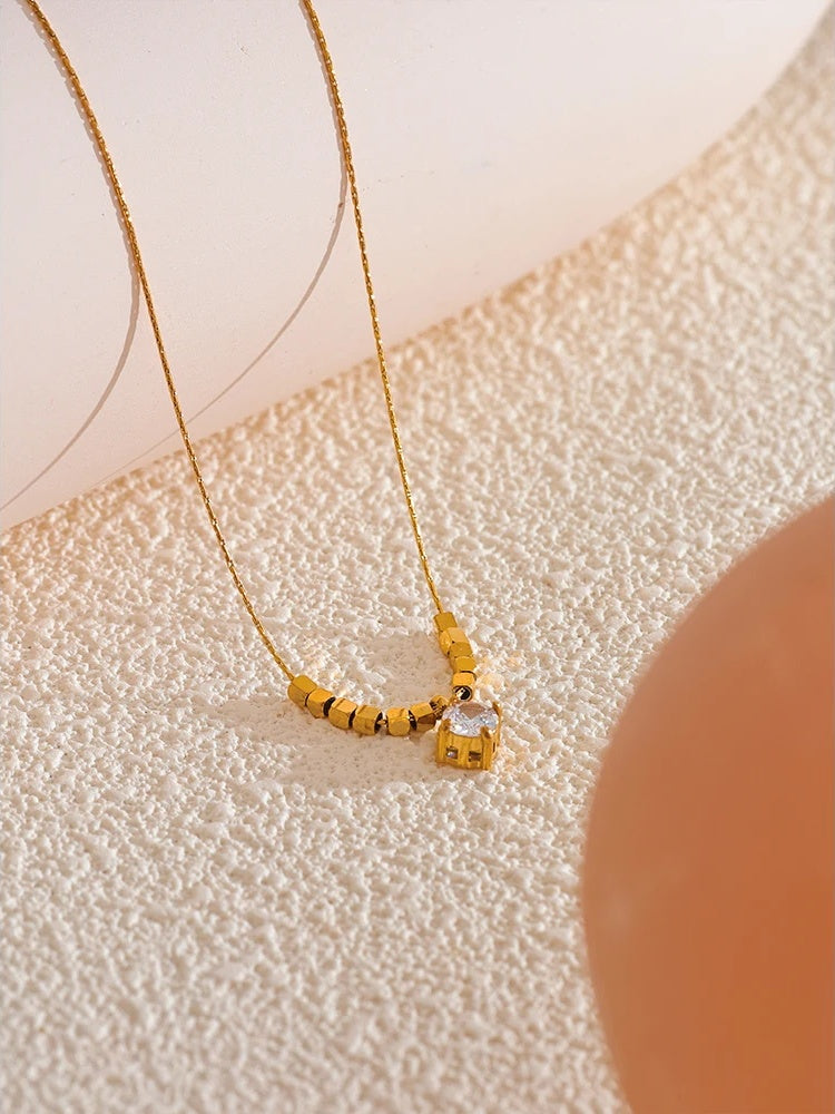 A delicate necklace featuring a geometric square chain design crafted from high-quality stainless steel with a polished gold finish. The pendant showcases a sparkling cubic zirconia stone set securely to catch the light beautifully. Lightweight and durable, this piece offers a trendy yet elegant look suitable for everyday wear or special occasions. Hypoallergenic materials ensure comfort for sensitive skin.