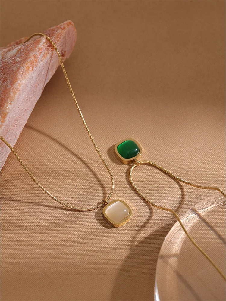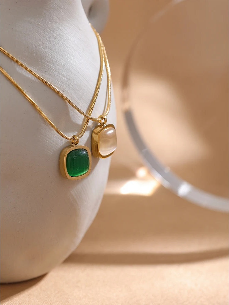 Whether you’re drawn to the vivid green or the soft opal glow, this geometric pendant adds a refined touch to any look and pairs beautifully with other dainty gemstone jewelry.