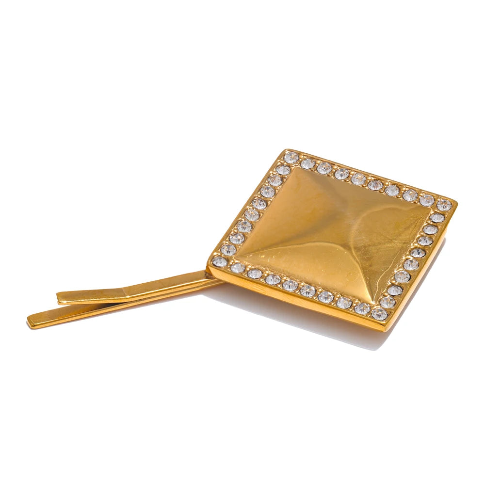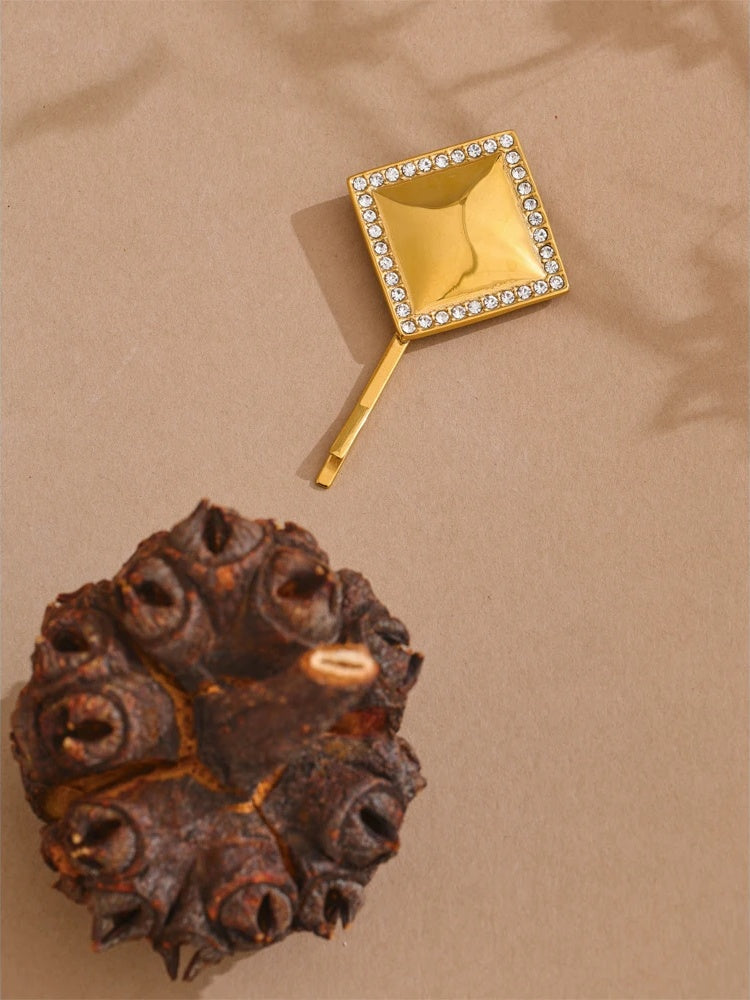 Crafted from stainless steel with a PVD real gold plating, this square hair pin features a minimalist geometric design accented by sparkling cubic zirconia stones. Its durable, waterproof construction ensures long-lasting wear while maintaining its shine. Perfect for securing hairstyles with an elegant, trendy touch.