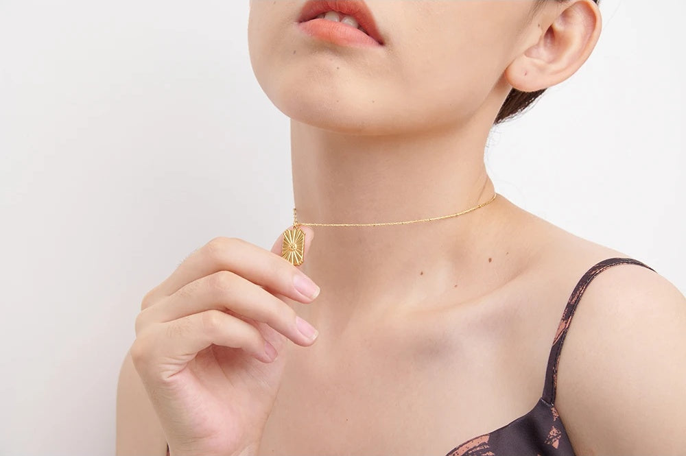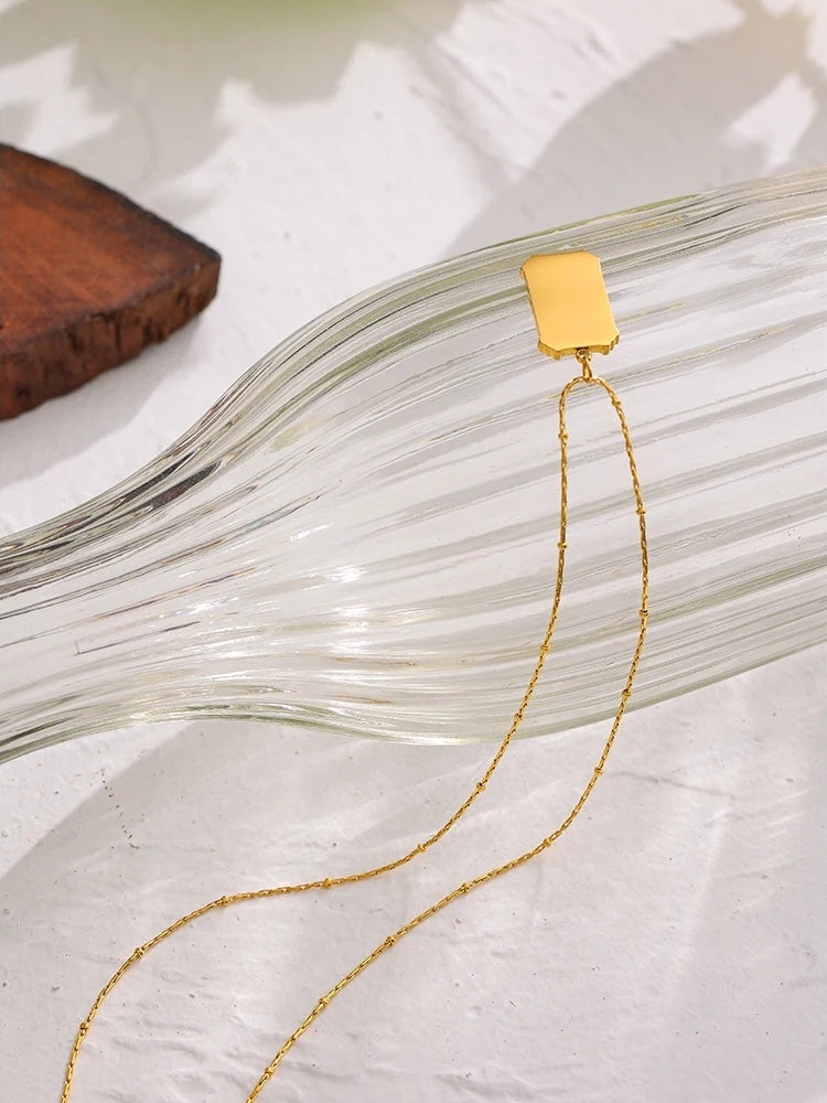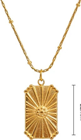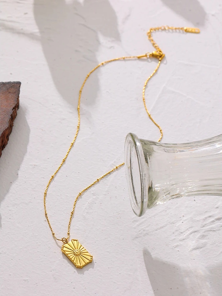 Crafted from durable stainless steel with an 18K PVD real gold plating, this necklace features a square pendant with a textured sunburst design. The pendant hangs from a delicate chain accented with small beads, creating a trendy and versatile accessory. Its corrosion-resistant finish ensures long-lasting wear, making it suitable for everyday use or special occasions. Designed for women, this collar necklace offers a modern yet timeless look.
