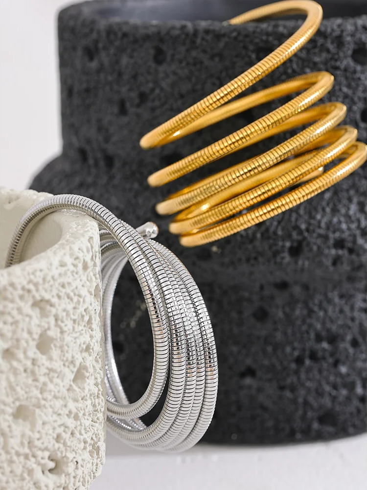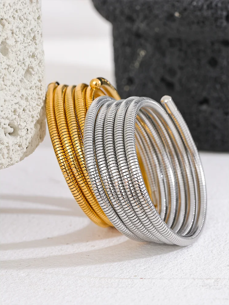 Crafted from durable stainless steel with a gold-color plating, this stackable multi-layer wrap bracelet offers a sleek, geometric design that fits comfortably on the arm. Its elastic construction ensures a flexible, one-size-fits-most fit suitable for both men and women. Water-resistant and fashion-forward, this bangle complements a variety of styles while maintaining its shine over time.