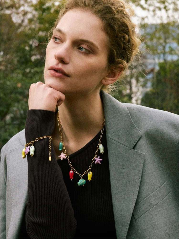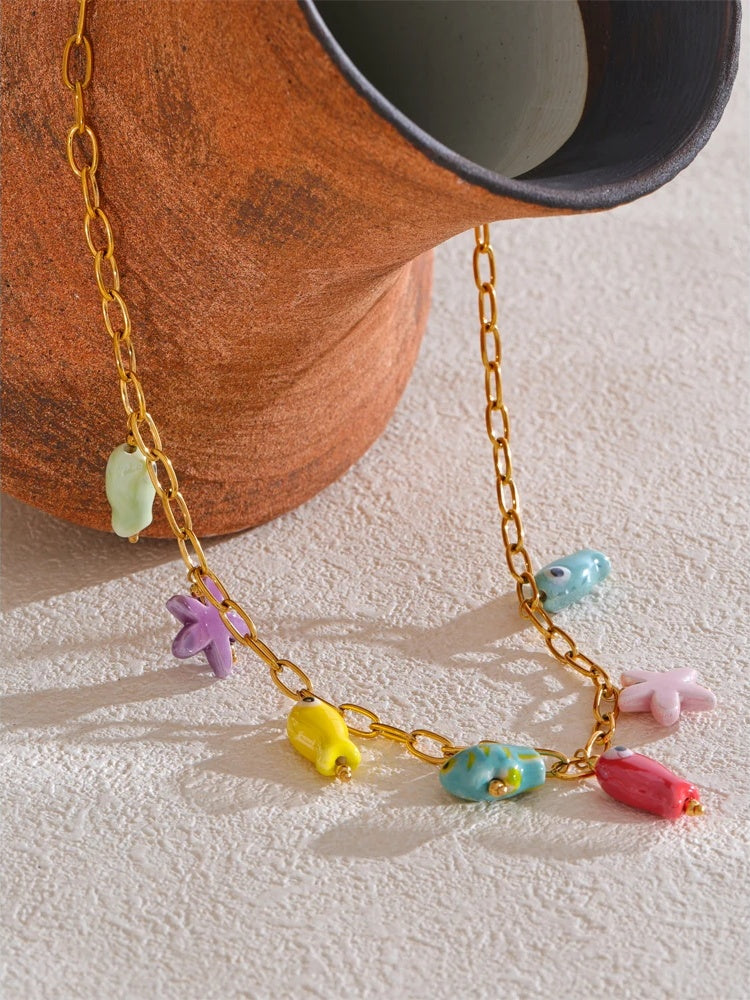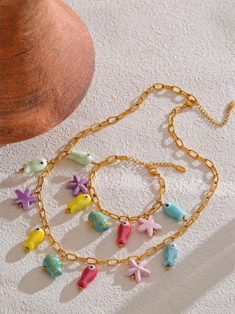 Crafted from PVD real gold plated stainless steel, this jewelry set features playful ceramic charms shaped like starfish and colorful fish. The combination of durable metal and vibrant ceramic elements offers a trendy and eye-catching look. Both necklace and bracelet options highlight geometric shapes that resist tarnishing, making them ideal for parties or casual wear. Lightweight and stylish, this set adds a distinctive touch to any outfit.